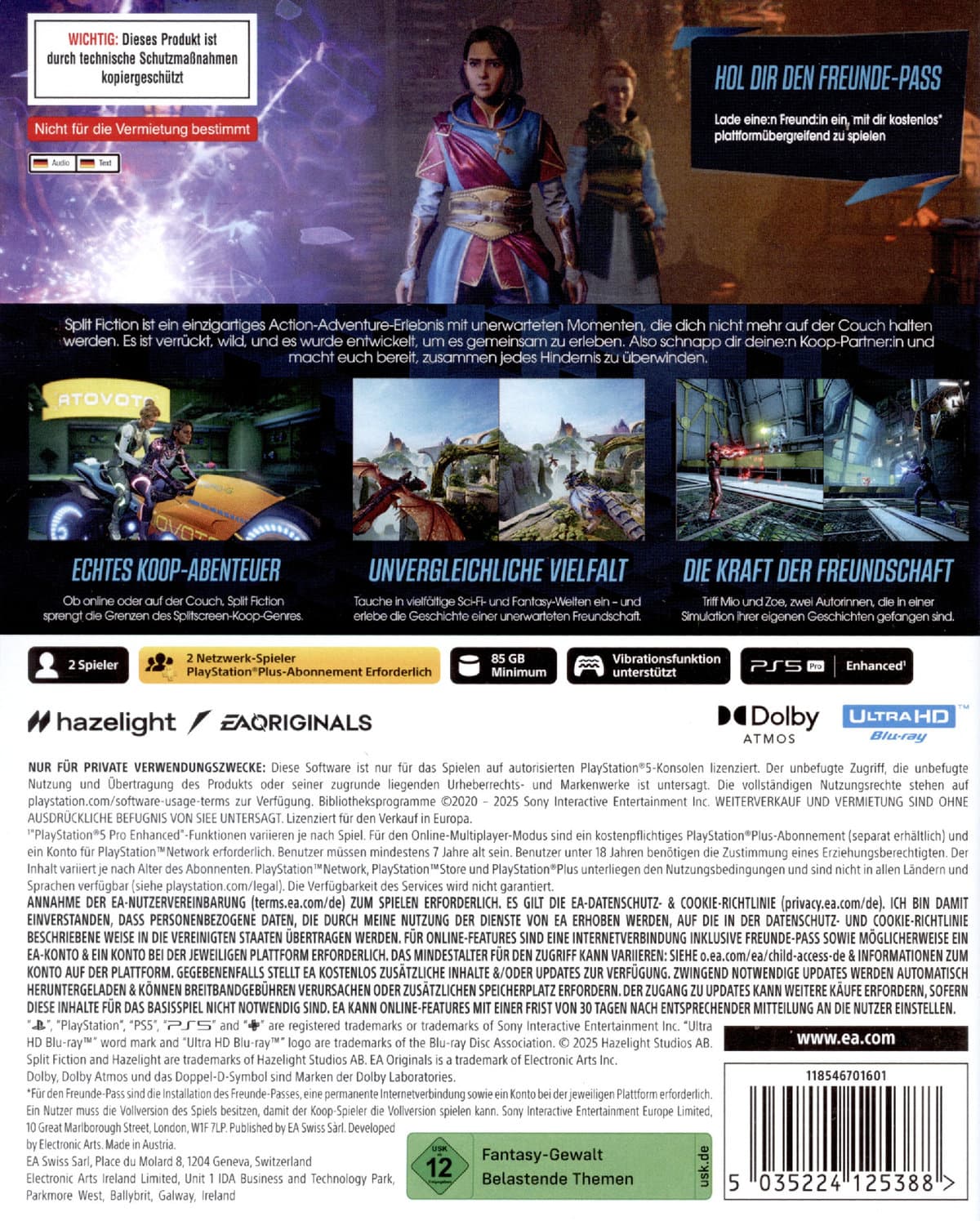 Erlebe atemberaubende Momente, wenn du tief in die vielen Welten von Split Fiction eintauchst – ein Koop-Abenteuer, das alle Grenzen überschreitet und von dem Studio hinter It Takes Two stammt. Spiele im Couch-Koop oder online mit dem Freunde-Pass.