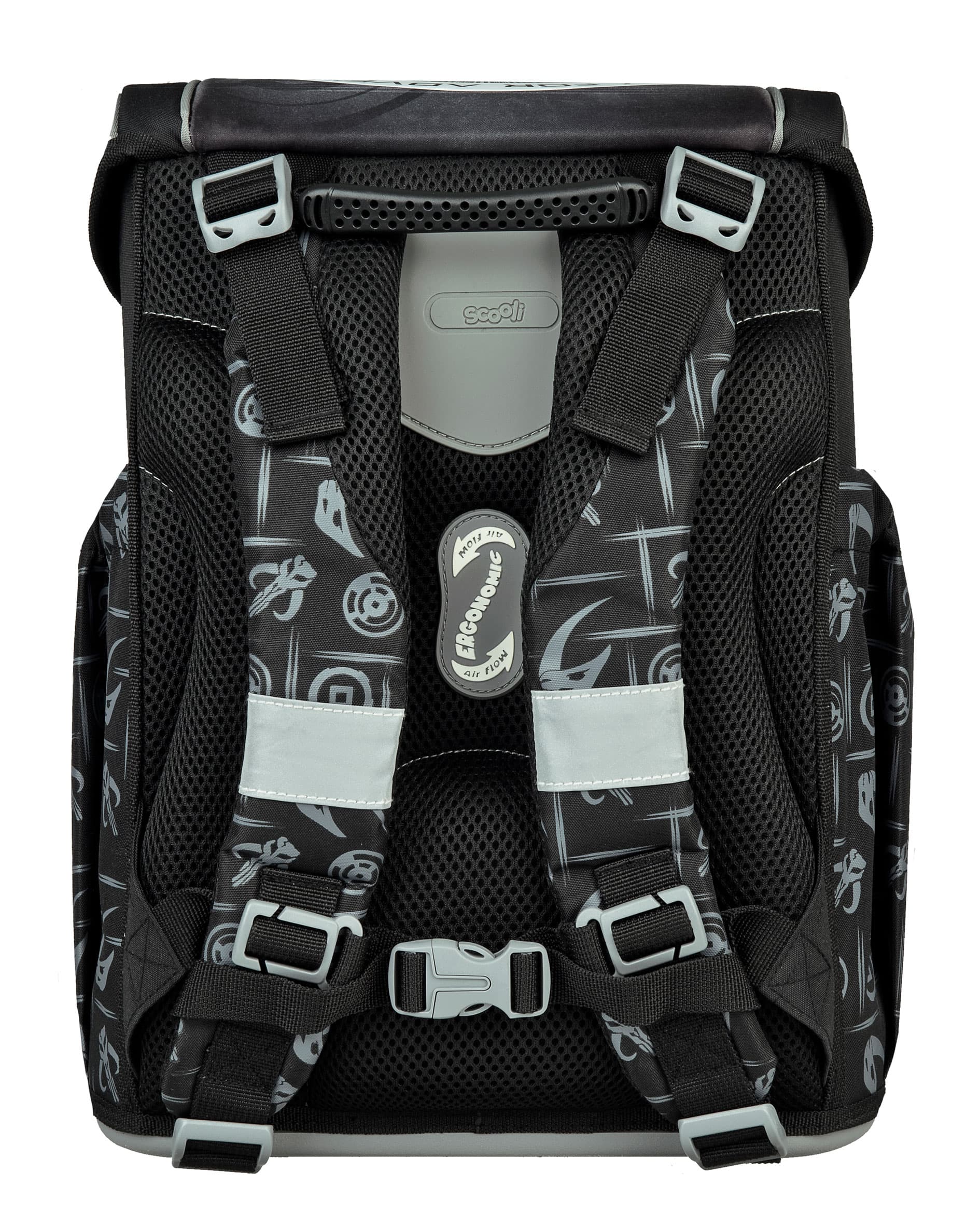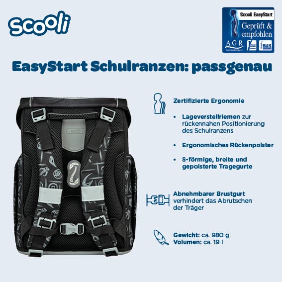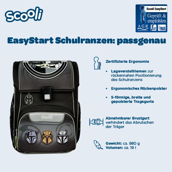 Der Scooli EasyStart Schulranzen im beliebten Star Wars Design begeistert mit einem galaktischen Look und durchdachter Ergonomie: Ausgezeichnet mit dem Gütesiegel Aktion Gesunder Rücken e.V. (AGR), lässt sich der Ranzen individuell an die Anatomie des Kindes anpassen. Mit nur ca. 980 g Gewicht ist er besonders leicht und durch sein schlankes Design ideal für Schulanfänger. Ein ergonomisches, atmungsaktives Rückenpolster, ein abnehmbarer Brustgurt und Lageverstellriemen sorgen für einen komfortablen, rückenschonenden Sitz.