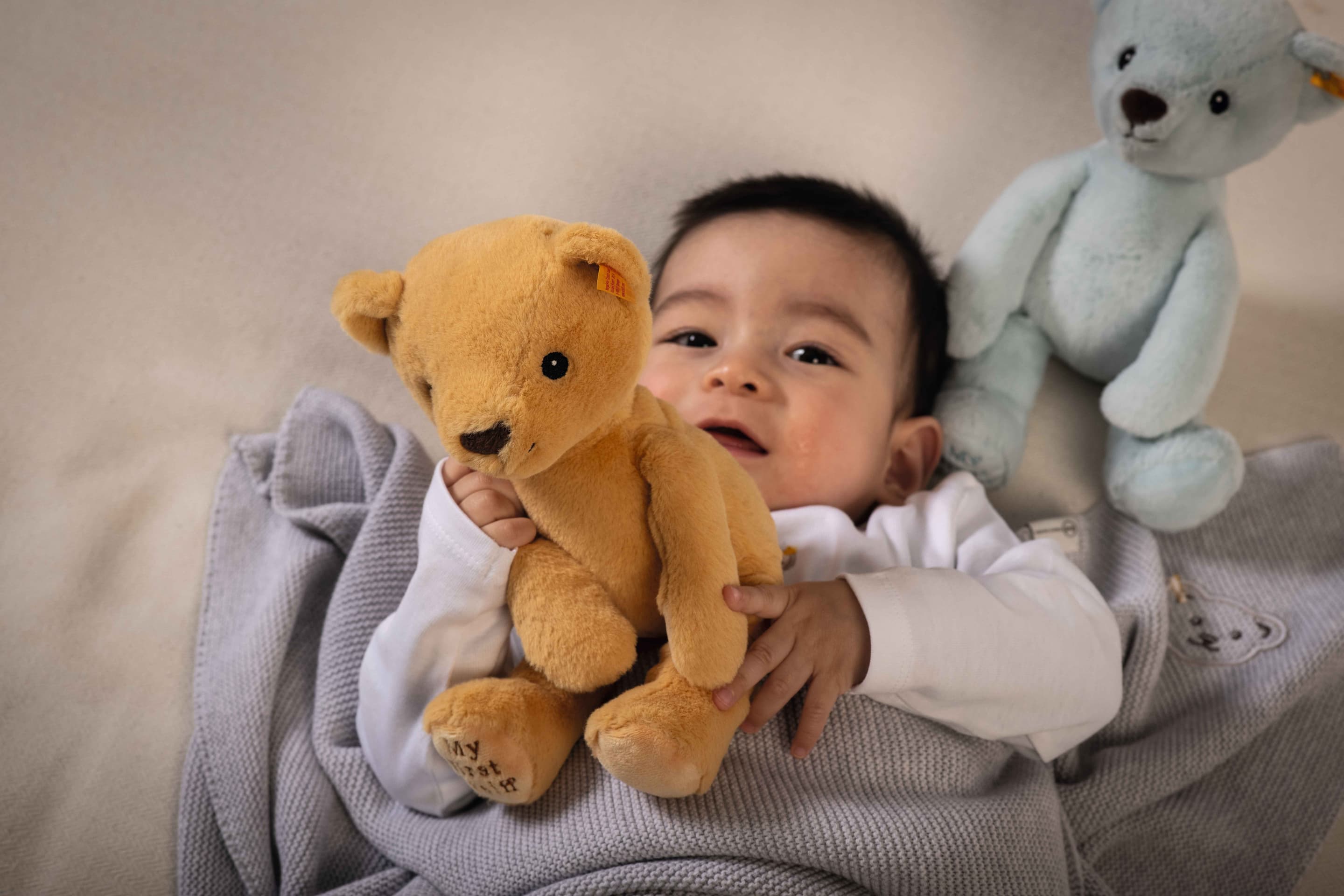 Der 26 cm große, kuschelweiche My first Steiff Teddybär hilft kleinen Mädchen und Jungs beim Entdecken. Er schmiegt sich an die Babywange, die Händchen spüren den babysanften Plüsch, die bestickte Teddybärensohle und die Granulatsäckchen in Armen, Beinen und Gesäß. Sie fühlen den Mund, die Nase, die Augen und die runden Ohren. Der Soft Cuddly Friends My first Steiff Teddybär in Beige ist ein liebevolles Geschenk für den Start ins Leben!Material:aus Plüsch für babysanfte HautOberstoff 1_Komponente 1 (%)100% PolyesterWaschbarkeit:30° C Schonwäsche, Nicht Bleichen, Nicht im Wäschetrockner trocknen, Nicht Bügeln, Nicht TrockenreinigenPflegehinweis:waschmaschinenfest bei 30° CFüllung:mit synthetischem Füllmaterial gestopftAugen:mit gestickten AugenFarbe:beigeGröße:26 cm