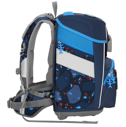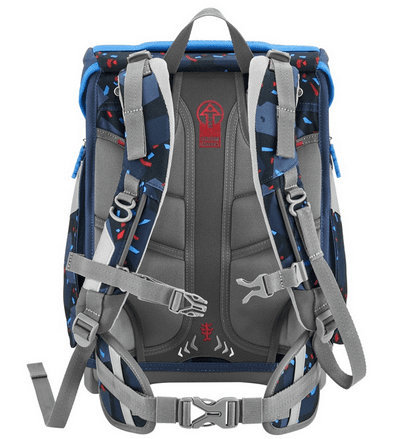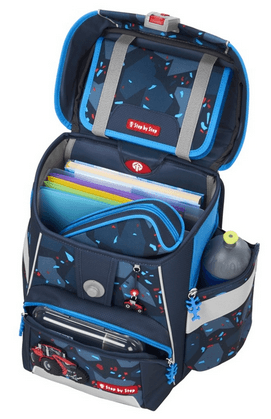 Tragekomfort/Ergonomie Anatomisch geformte Schulterträger, höhenverstellbar (EASY GROW SYSTEM) Lageverstellriemen Höhenverstellbarer Brustgurt Abnehmbarer Hüftgurt Vorgeformtes, weiches Rückenpolster Verstaumöglichkeiten Hauptfach, Vordertasche, zwei Seitentaschen mit Reißverschluss und Auslaufösen Gummibänder zur Fixierung des Federmäppchens unter dem Deckel Inneneinteiler mit Gummizug für Bücher Sicherheit Reflektierende Elemente aus an Fronttasche, Seitentaschen und Schultergurten Weitere Features Leicht bedienbarer Fidlock-Magnetverschluss Aufhängungen zum Verstauen der Enden der Schulterriemen Aufhängeschlaufe Tragegriff Namens- und Adressfeld im Deckel Kleines Fach mit Schlüsselanhänger im Hauptfach