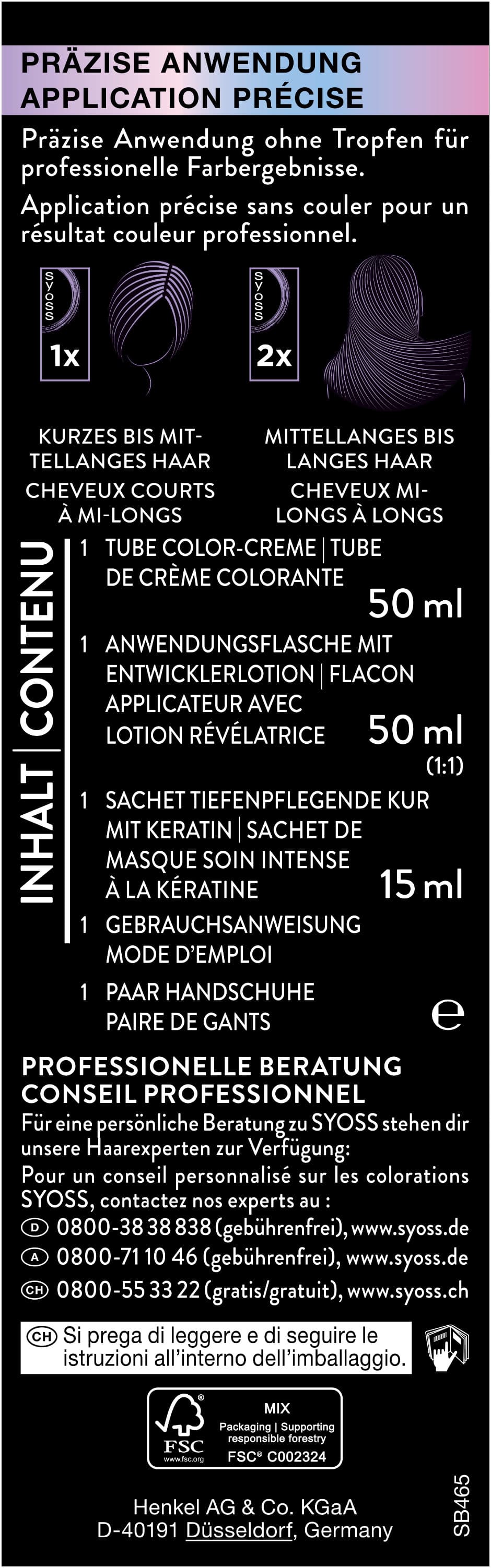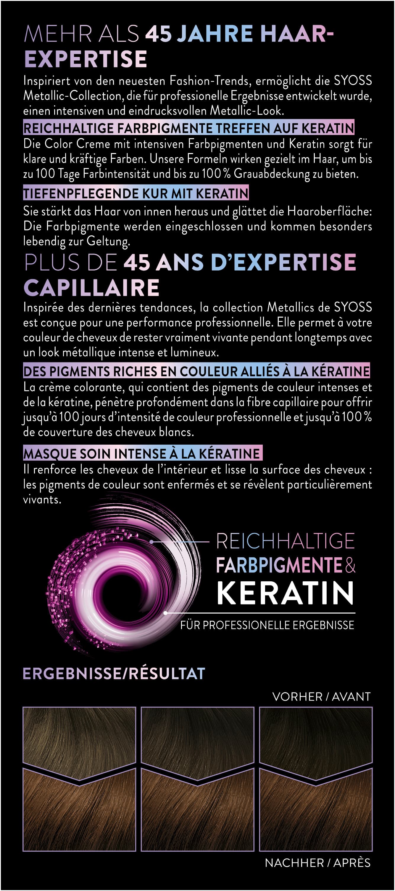• Metallic Farbtöne – SYOSS Color Metallic ist eine dauerhaft haltbare Coloration für softe Metallic-Farbtöne mit eindrucksvollen Reflexen sowie bis zu 100 Tage Farbintensität