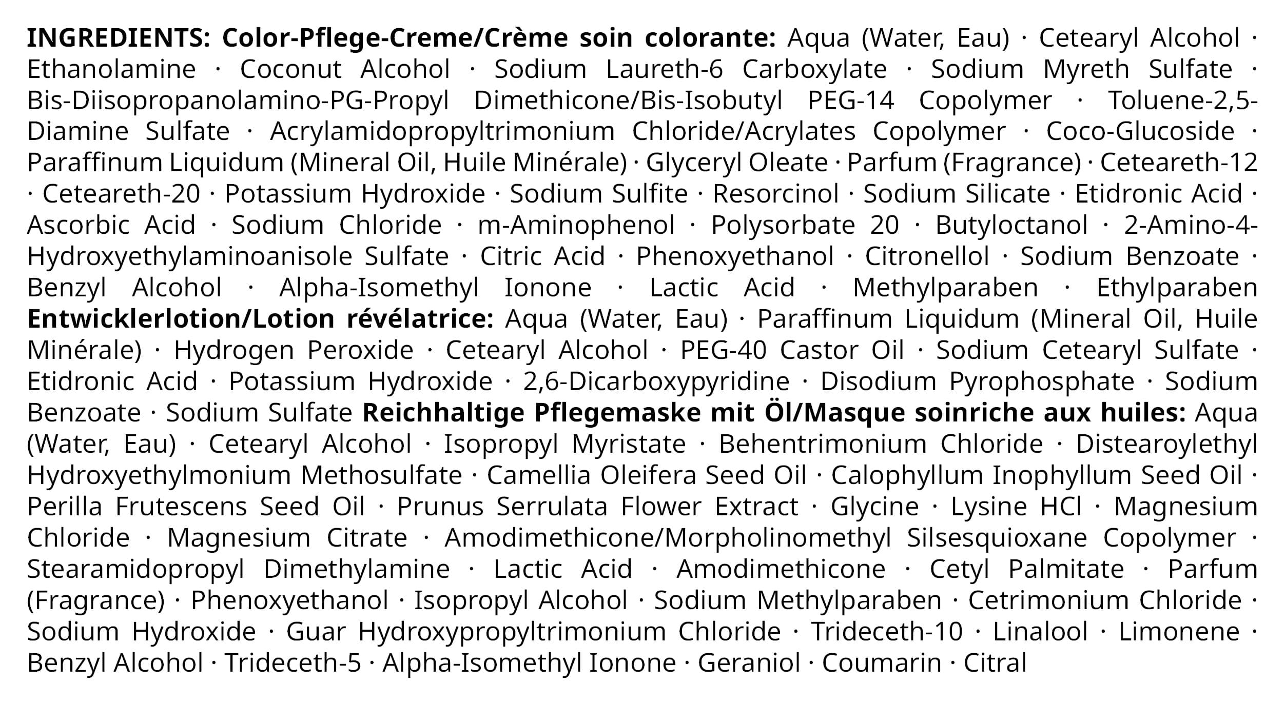 | Inhaltsstoffe | Color-Pflege-Creme/Creme soin colorante: Aqua (Water, Eau), Cetearyl Alcohol, Ethanolamine, Coconut Alcohol, Sodium Laureth-6 Carboxylate, Sodium Myreth Sulfate, Bis-Diisopropanolamino-PG-Propyl Dimethicone/Bis-Isobutyl PEG-14 Copolymer, Toluene-2,5-Diamine Sulfate, Acrylamidopropyltrimonium Chloride/Acrylates Copolymer, Coco-Glucoside, Paraffinum Liquidum (Mineral Oil, Huile Minérale), Glyceryl Oleate, Parfum (Fragrance), Ceteareth-12, Ceteareth-20, Potassium Hydroxide, Sodium Sulfite, Resorcinol, Sodium Silicate, Etidronic Acid, Ascorbic Acid, Sodium Chloride, m-Aminophenol, Polysorbate 20, Butyloctanol,2-Amino-4-Hydroxyethylaminoanisole Sulfate, Citric Acid, Phenoxyethanol, Citronellol, Sodium Benzoate, Benzyl Alcohol, Alpha-Isomethyl Ionone, Lactic Acid, Methylparaben, Ethylparaben Entwicklerlotion/Lotion revelatrice: Aqua (Water, Eau), Paraffinum Liquidum (Mineral Oil, Huile Minérale), Hydrogen Peroxide, Cetearyl Alcohol, PEG-40 Castor Oil, Sodium Cetearyl Sulfate, Etidronic Aci |