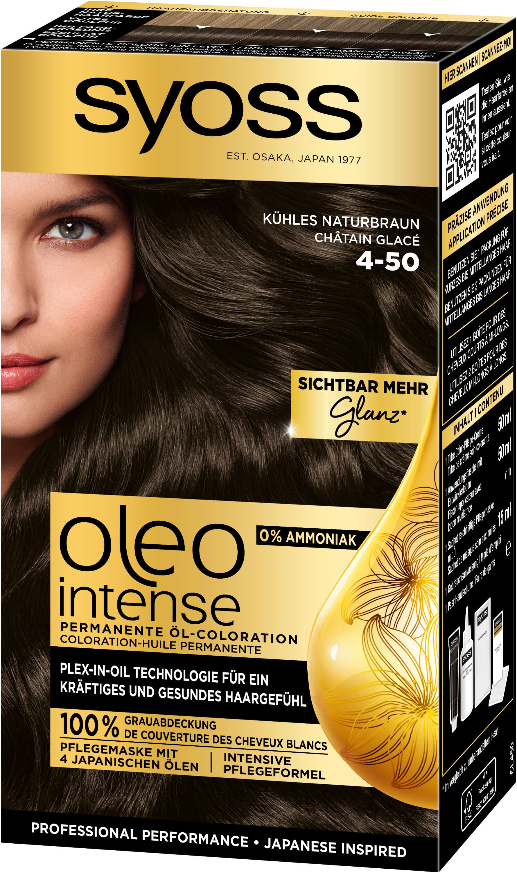 SYOSS Oleo Intense permanente Öl-Coloration ohne Ammoniak – Permanente Haarfarbe mit 4 japanischen Ölen.Die Öl-aktivierte Coloration ohne Ammoniak mit innovativer Plex-In-Oil Technologie umhüllt die Haarfasern wie ein Schutzschild, um das Haar zu stärken und die Haarstruktur zu verbessern. Die in der Nachbehandlung enthaltenen 4 japanischen Öle wie Tsubaki-, Sakura-, Shiso- und Tamanu-Öl verwöhnen Ihr Haar auch nach dem Colorieren und schenken Ihrem Haar die ultimative Pflege und hinterlassen ein samtweiches Haargefühl mit intensivem Farbglanz.Produktvorteile im Detail:Mit 4 japanischen ÖlenPflegt das Haar intensiv nach dem ColorierenOhne AmmoniakBis zu 100 % GrauabdeckungFormel tropft nichtAnwendung:Präzise Anwendung ohne Tropfen für professionelle Farbergebnisse. Vor der Anwendung einen Kleiderschutz und eine Uhr zur Kontrolle der Einwirkzeit bereitlegen. SYOSS Oleo Intense wird auf trockenem, nicht vorgewaschenem Haar angewendet. Es wird empfohlen, das Haar 24-48 Stunden vor der Anwendung nicht zu waschen.Darf nicht in die Hände von Kindern gelangen.