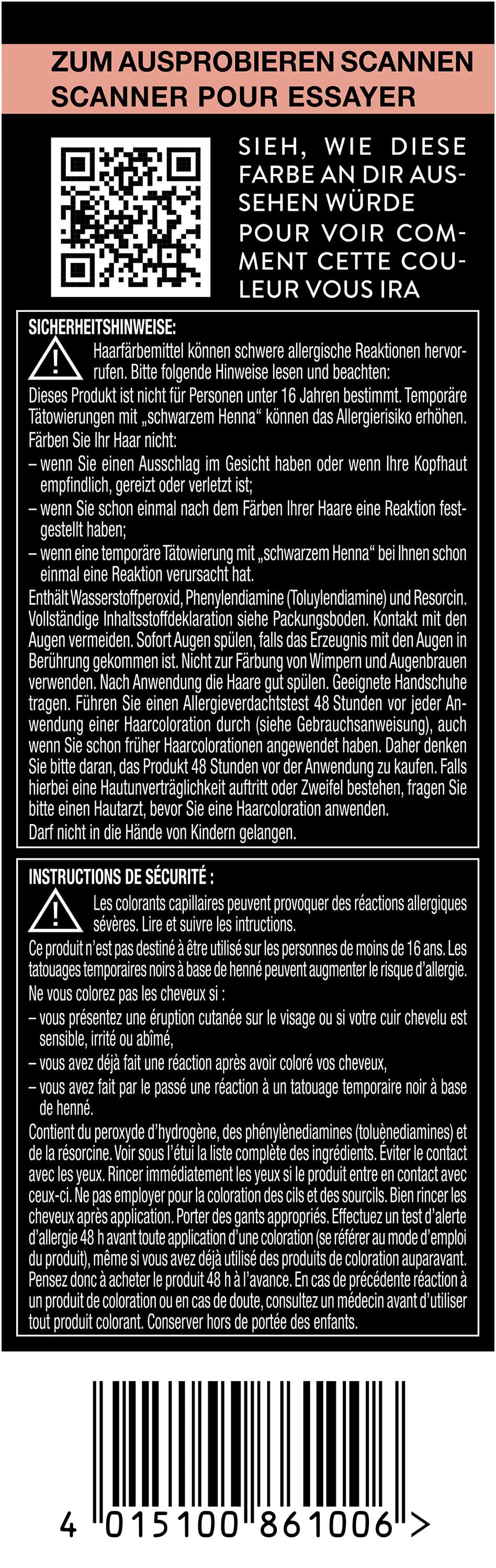 Enthält Wasserstoffperoxid, Phenylendiamine (Toluylendiamine) und Resorcin. Vollständige Inhaltsstoffdeklaration siehe Packungsboden. Kontakt mit den Augen vermeiden. Sofort Augen spülen, falls das Erzeugnis mit den Augen in Berührung gekommen ist. Nicht zur Färbung von Wimpern und Augenbrauen verwenden. Nach Anwendung die Haare gut spülen. Geeignete Handschuhe tragen. Führen Sie einen Allergieverdachtstest 48