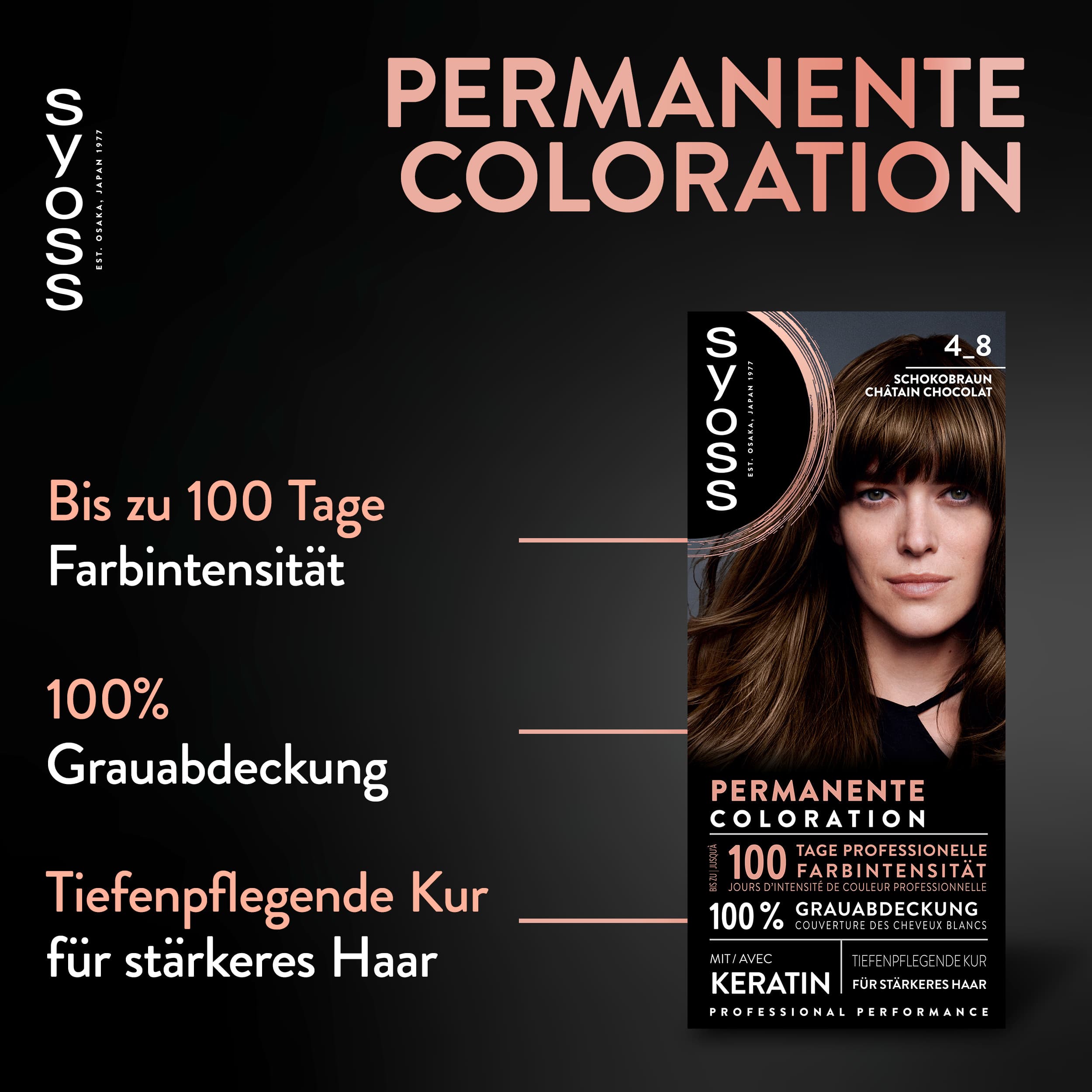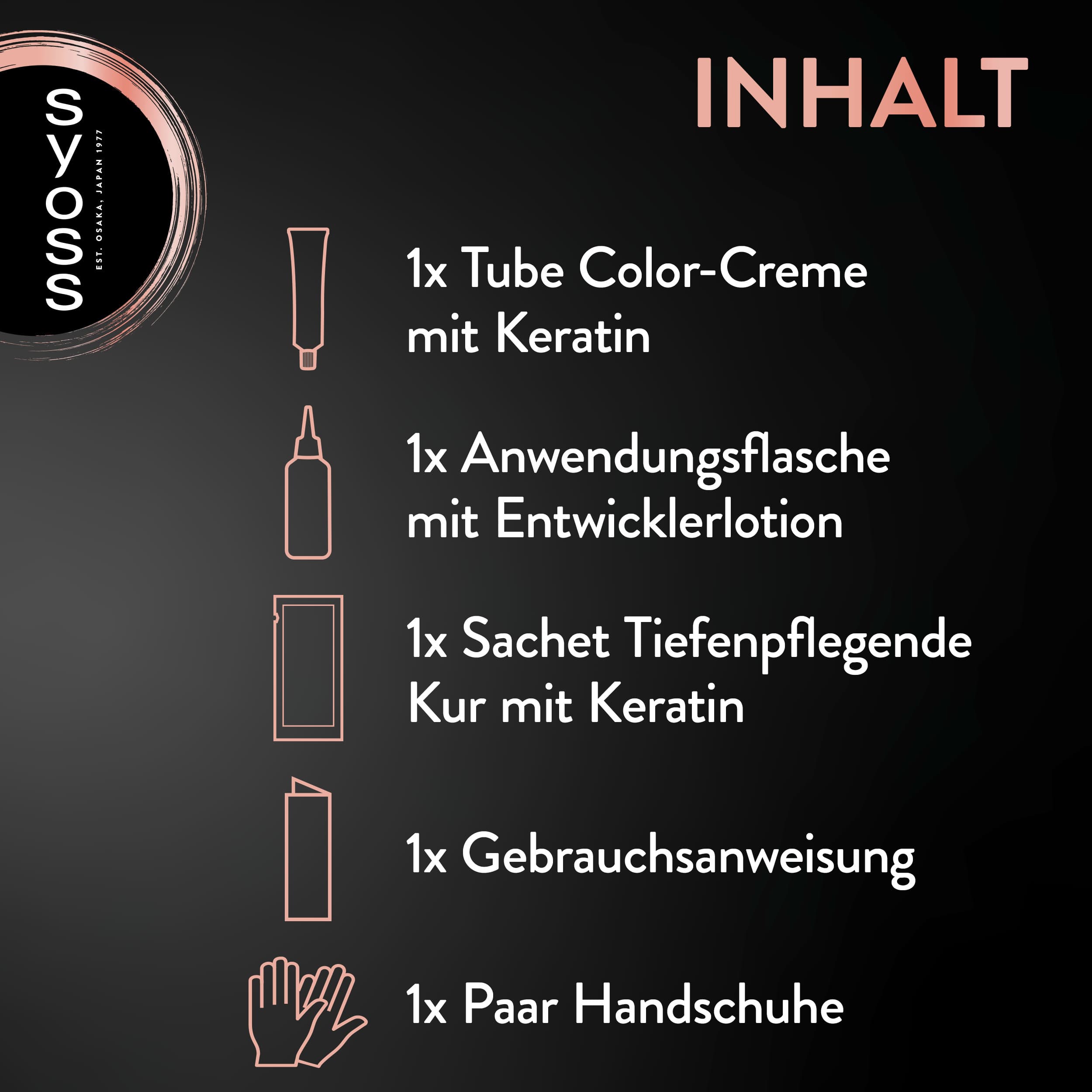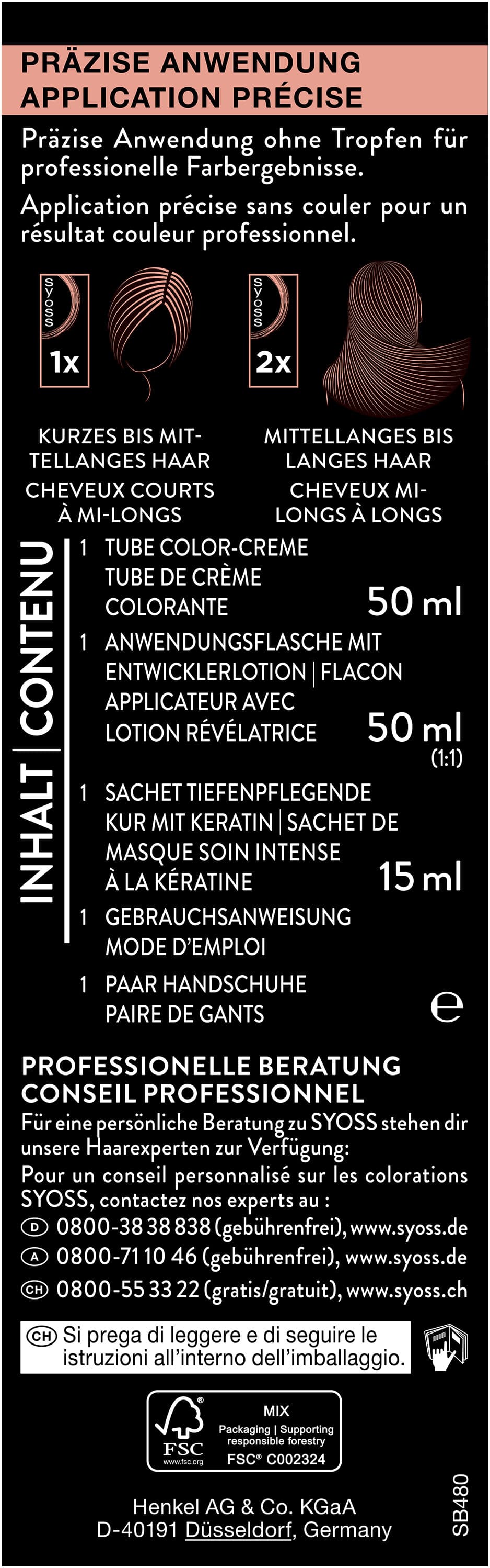 SYOSS permanente Coloration – 100 Tage professionelle Farbintensität und Tiefenpflege. Die permanente Coloration von Syoss, die für professionelle Ergebnisse entwickelt wurde, sorgt für einen intensiven Look, bis zu 100 Tage Farbintensität und 100 % Grauabdeckung. Für ein besonders strahlendes Farbergebnis sind sowohl die dauerhafte Haarfarbe, als auch die beiliegende Haarkur, mit Keratin angereichert, welches das Haar von innen heraus stärkt und die Haaroberfläche glättet. Dadurch werden die Farbpigmente