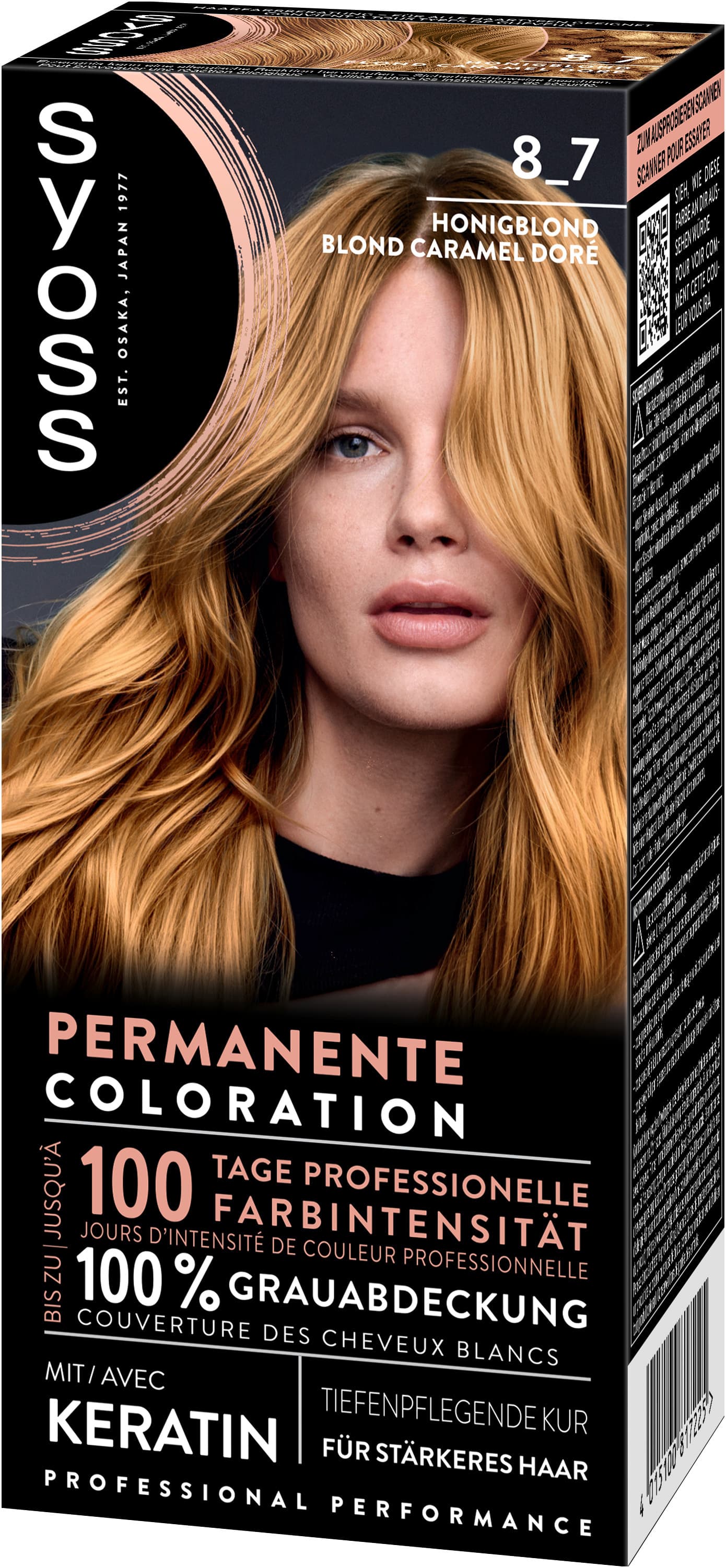 SYOSS permanente Coloration – 100 Tage professionelle Farbintensität und Tiefenpflege. Die permanente Coloration von Syoss, die für professionelle Ergebnisse entwickelt wurde, sorgt für einen intensiven Look, bis zu 100 Tage Farbintensität und 100 % Grauabdeckung. Für ein besonders strahlendes Farbergebnis sind sowohl die dauerhafte Haarfarbe, als auch die beiliegende Haarkur, mit Keratin angereichert, welches das Haar von innen heraus stärkt und die Haaroberfläche glättet. Dadurch werden die Farbpigmente