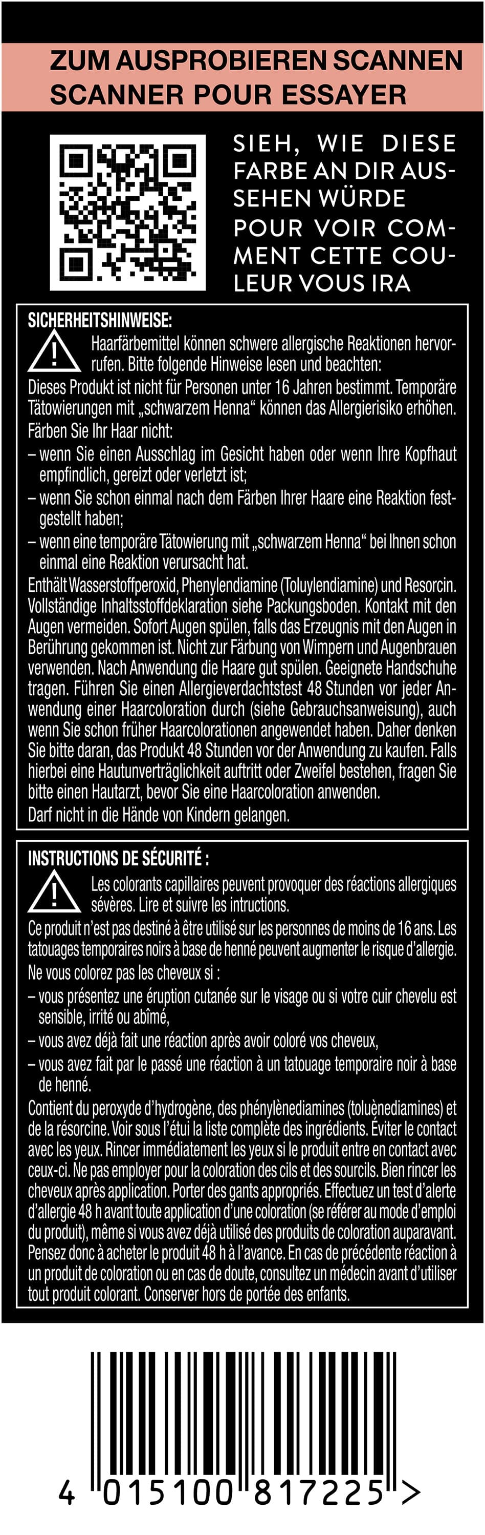 Haarfärbemittel können schwere allergische Reaktionen hervorrufen. Bitte folgende Hinweise lesen und beachten: Dieses Produkt ist nicht für Personen unter 16 Jahren bestimmt. Temporäre Tätowierungen mit "schwarzem Henna" können das Allergierisiko erhöhen. Färben Sie Ihr Haar nicht: - wenn Sie einen Ausschlag im Gesicht haben oder wenn Ihre Kopfhaut empfindlich, gereizt oder verletzt ist, - wenn Sie schon einmal nach dem Färben Ihrer Haare eine Reaktion festgestellt haben, - wenn eine temporäre Tätowierung mit "schwarzem Henna" bei Ihnen schon einmal eine Reaktion verursacht hat. Enthält Wasserstoffperoxid, Phenylendiamine (Toluylendiamine) und Resorcin. Vollständige Inhaltsstoffdeklaration siehe Packungsboden. Kontakt mit den Augen vermeiden. Sofort Augen spülen, falls das Erzeugnis mit den Augen in Berührung gekommen ist. Nicht zur Färbung von Wimpern und Augenbrauen verwenden. Nach Anwendung die Haare gut spülen. Geeignete Handschuhe tragen. Führen Sie einen Allergieverdachtstest 4