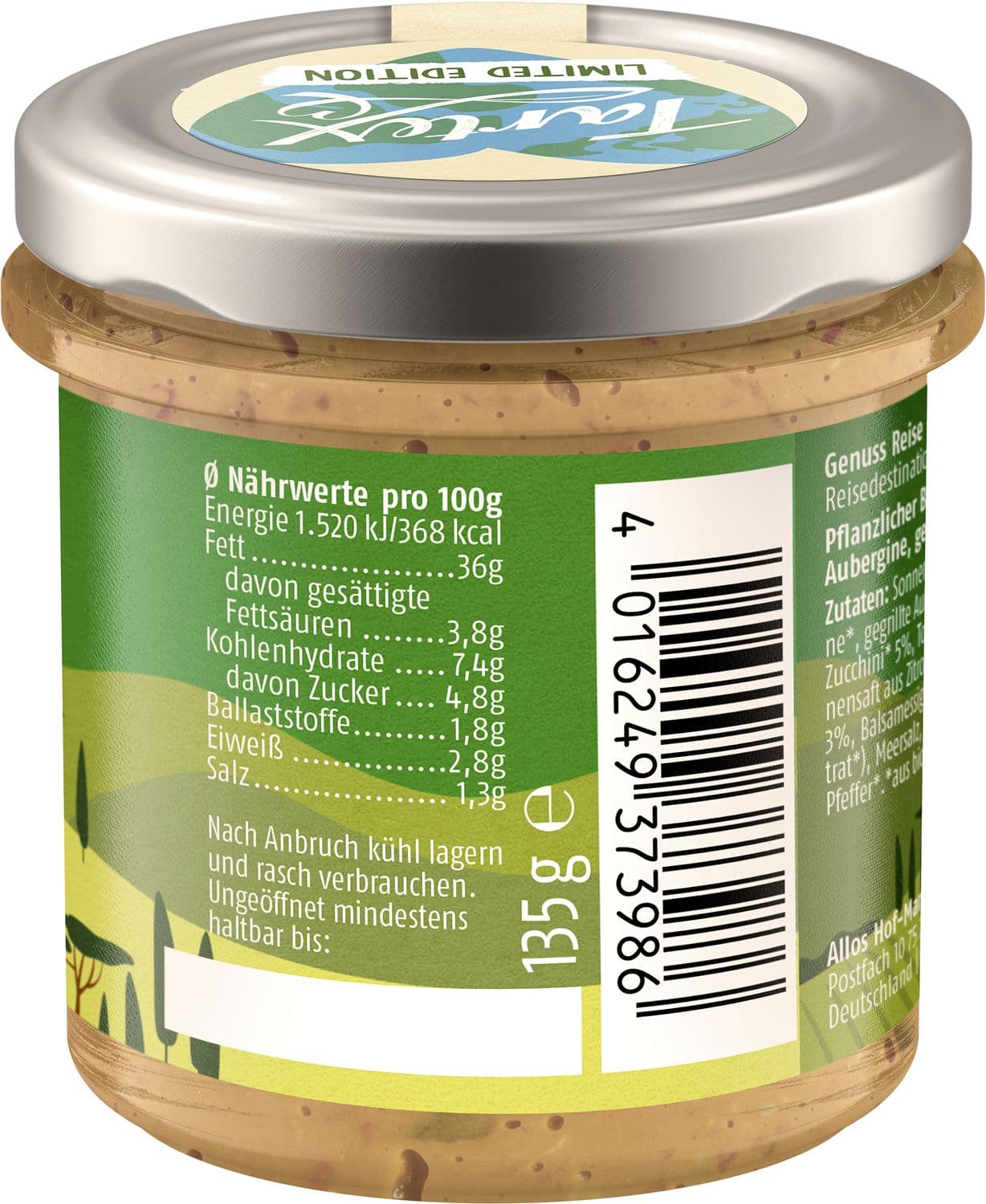 | Zutaten | Sonnenblumenöl*, Wasser, Sonnenblumenkerne*, gegrillte Auberginen* 5%, gegrillte rote Paprika* 5%, Zucchini* 5%, Tomatenmark*, Apfelsaftkonzentrat*, Zitronensaft aus Zitronensaftkonzentrat*, Zwiebeln*, Basilikum* 3%, Balsamessig* (Weißweinessig*, Traubenmostkonzentrat*), Meersalz, Knoblauch*, Zwiebelpulver*, schwarzer Pfeffer*. *aus biologischem Landbau. |