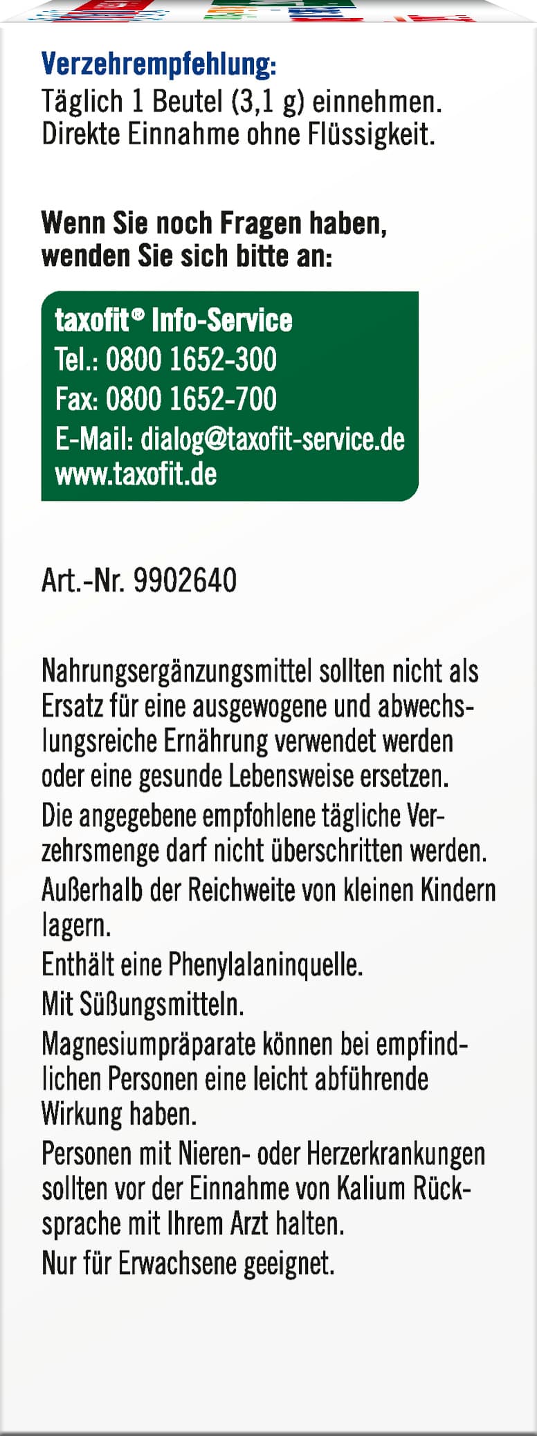 Nahrungsergänzungsmittel sollten nicht als Ersatz für eine ausgewogene und abwechslungsreiche Ernährung verwendet werden oder eine gesunde Lebensweise ersetzen. #Die angegebene empfohlene tägliche Verzehrsmenge darf nicht überschritten werden. #Außerhalb der Reichweite von kleinen Kindern lagern. #Enthält eine Phenylalaninquelle. #Mit Süßungsmitteln. #Magnesiumpräparate können bei empfindlichen Personen eine leicht abführende Wirkung haben. #Personen mit Nieren-oder Herzerkrankungen sollten vor der Einnahme von Kalium Rücksprache mit ihrem Arzt halten. #Nur für Erwachsene geeignet. #Täglich 1 Beutel (3,1 g) einnehmen.