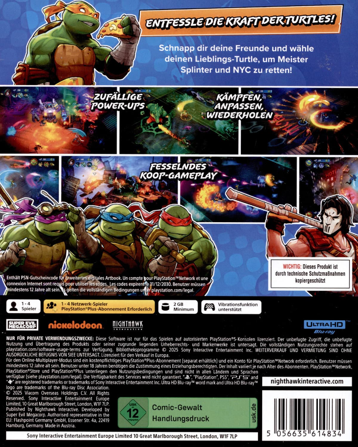 Entfessle die Turtle Power! Schnapp dir deine Freunde, wähle deine Lieblingsturtle und stürze dich in ein roguelike Abenteuer, um Meister Splinter vor dem Foot Clan zu retten! Meistere deine Ninja-Fähigkeiten, vereint euch im abgefahrenen Online- und lokalen Koop-Modus und erobert legendäre Schauplätze in New York City! In Teenage Mutant Ninja Turtles: Splintered Fate erwartet dich rasante Roguelike-Action, bei der kein Durchgang dem anderen gleicht. Mit zufälligen Power-Ups, Raumanordnungen und Boss-Modifikatoren nimmt die Spannung kein Ende. Übernimm die Kontrolle über alle vier Turtles, von denen jeder über einzigartige Kräfte verfügt, und schließe dich mit Freunden für ein fesselndes Ko-op-Gameplay zusammen. Erkunde ikonische Orte in NYC, verbessere deine Turtle-Kräfte und bereite dich auf den Kampf gegen mächtige Gegner vor. EINE FESSELNDE GESCHICHTE Als Splinter von Shredder entführt wird, tauchen gleichzeitig mysteriöse Portale in ganz New York City auf. Während April und Metalhead geborgene Artefakte analysieren, um Hinweise zu finden, kämpfen die Turtles darum, ihren Vater aus den Fängen des Foot Clans zu befreien. Doch je näher sie Splinters übernatürlichem Aufenthaltsort kommen, desto mehr bahnt sich eine noch größere Bedrohung aus den Schatten an. ENTFALTE DEINE KRAFT Meistere die Kräfte von Wasser und Feuer, Utrom und Schleim, Licht und Dunkelheit - und vor allem: die des Ninjas - um einzigartige und abgefahrene Builds für deine Turtles zu erschaffen. Jeder Durchlauf bringt neue Herausforderungen und Chancen - erkunde, perfektioniere deine Lieblings-Builds und kombiniere sie mit denen deiner Verbündeten, um deine Feinde zu besiegen. CASEY JONES, VOM ERSATZBÄNKLER ZUM HELDEN! Die Turtles können jede Hilfe gebrauchen, wenn sie sich Shredder stellen und versuchen, ihren Vater zurückzuholen. Zum Glück ist ihr Freund und Mitstreiter Casey Jones immer bereit, seinen Hockeyschläger zu schwingen und für Chaos zu sorgen. Und mehr noch: Er kennt sogar eine Abkürzung direkt zu den Dächern von New York City! Seltsamerweise führt ihr Weg mitten durch die Schrottplätze und das Revier der Punk Frösche. Hat das vielleicht etwas mit Caseys verschwundenem Gefährt zu tun? Die Deluxe Edition enthält die von der Kritik gefeierte Casey Jones & the Junkyard Jam-Erweiterung! Mit einem neuen spielbaren Charakter, dem Schrottplatz-Level, neuen Bossen, Gegnern und vielem mehr! Und das ist noch nicht alles: Jede Deluxe Edition enthält ein Paket mit zehn offiziellen Sammelkarten - solange der Vorrat reich! Sprachaufnahme: Englisch Untertitel: Deutsch, Englisch, Französisch, Italienisch, Spanisch, Portugiesisch, Niederländisch, Russisch, Japanisch, Koreanisch, Vereinfachtes Chinesisch, Traditionelles Chinesisch.