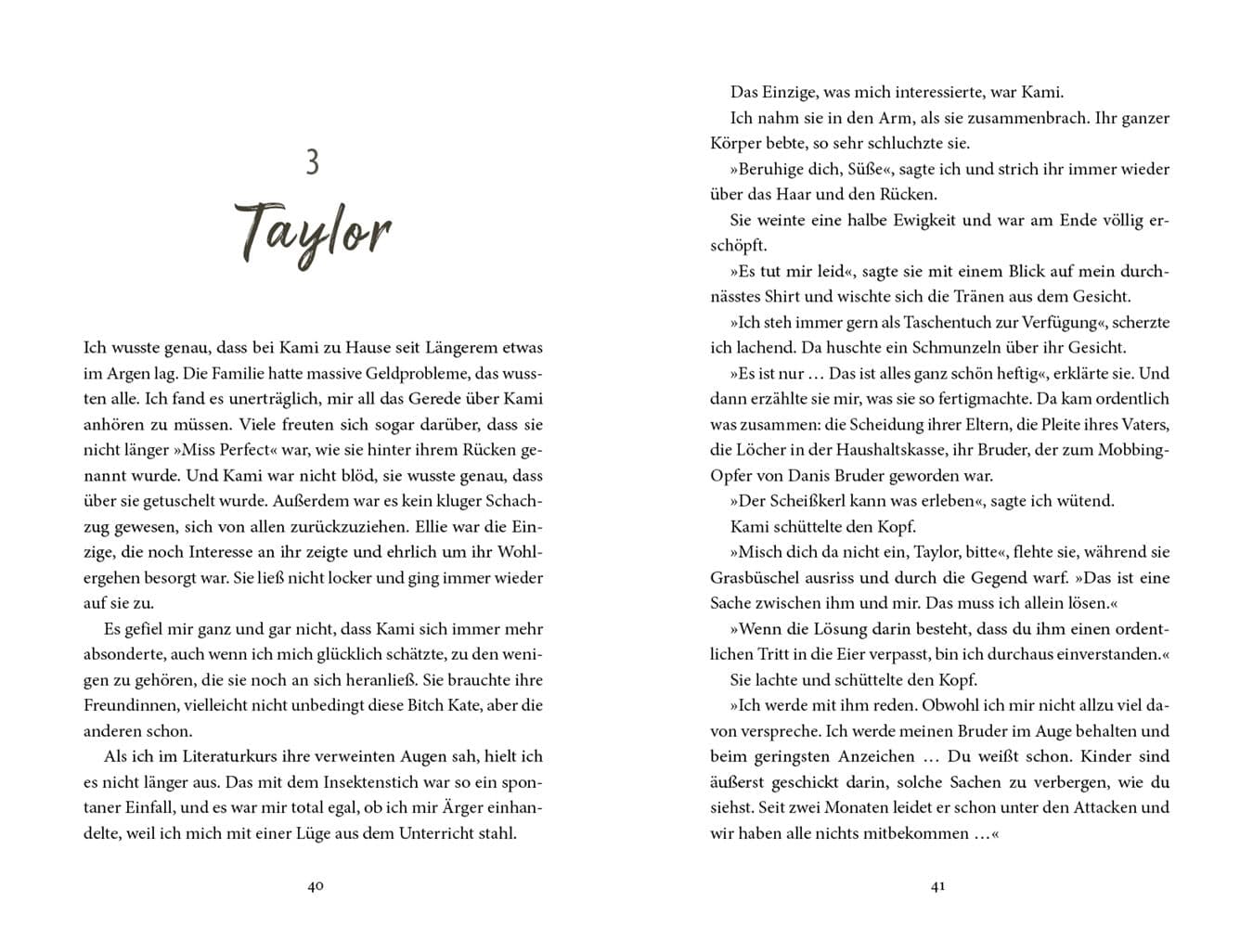 Kamilas beste Kindheitsfreunde sind wieder in ihr Leben getreten. Thiago und seine grünen Augen rauben ihr den Atem. Taylor mit seinen blauen Augen wird sie nie enttäuschen. Kami möchte weder den einen noch den anderen missen. Als ihr Leben aus den Fugen gerät, ihre Eltern sich scheiden lassen und ihre Freundinnen ihr den Rücken kehren, braucht sie die Brüder mehr denn je. Und dann küsst Thiago eine andere und Taylors Gefühle für Kami sind stärker als ihre für ihn. Als wäre das nicht genug, scheint ihr Ex-Freund nicht nur ihr, sondern auch ihrem kleinen Bruder das Leben zur Hölle machen zu wollen. Kami ahnt nicht, wie weit er zu gehen bereit ist.
