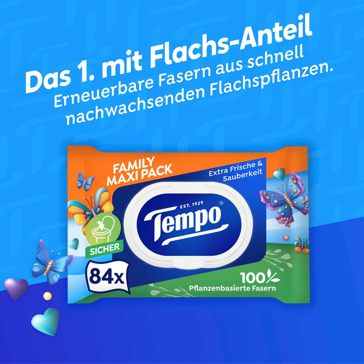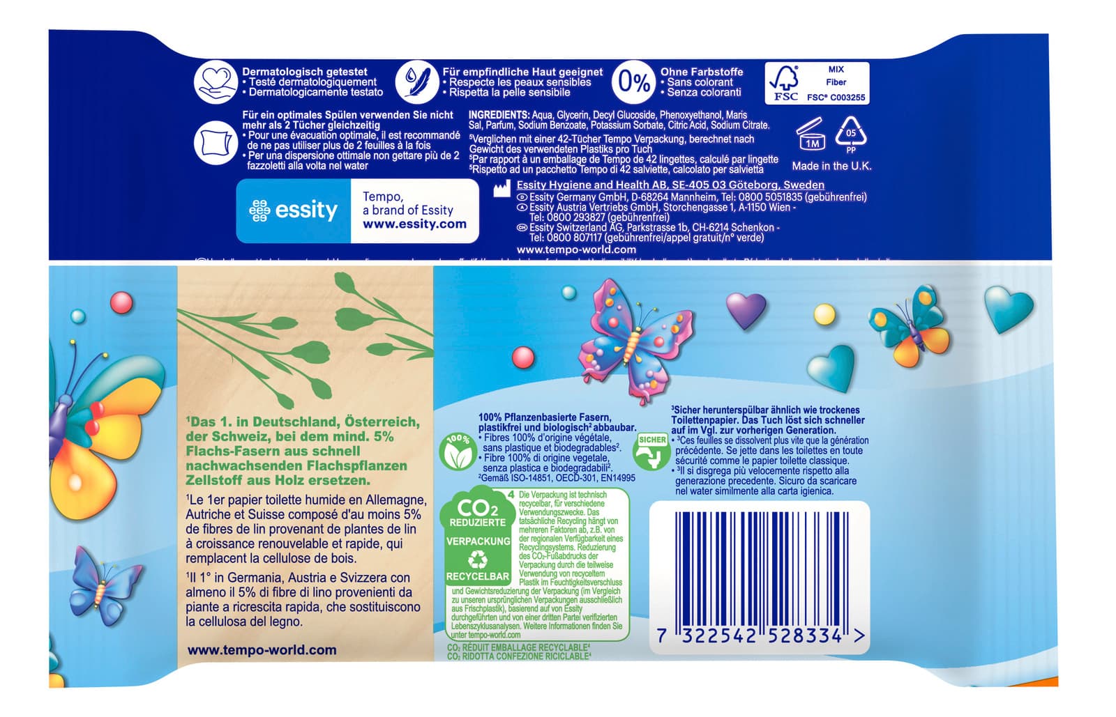 *Das Tempo-Substrat enthält mind. 5% Flachsfasern. Dat 1. mit Flachs-Anteil in Deutschland, Österreich, der Schweiz **gemäß ISO14851, OECD 301 & EN14995 ***Die Verpackung ist technisch recycelbar, für verschiedene Verwendungszwecke. Das tatsächliche Recycling hängt von mehreren Faktoren ab, z.B. von der regionalen Verfügbarkeit eines Recyclingsystems. Reduzierung des CO2-Fußabdrucks der Verpackung durch die teilweise Verwendung von recyceltem Plastik im Feuchtigkeitsverschluss und Gewichtsreduzierung der Verpackung (im Vergleich zu unseren ursprünglichen Verpackungen ausschließlich aus Frischplastik), basierend auf von Essity durchgeführten und von einer dritten Partei verifizierten Lebenszyklusanalysen.