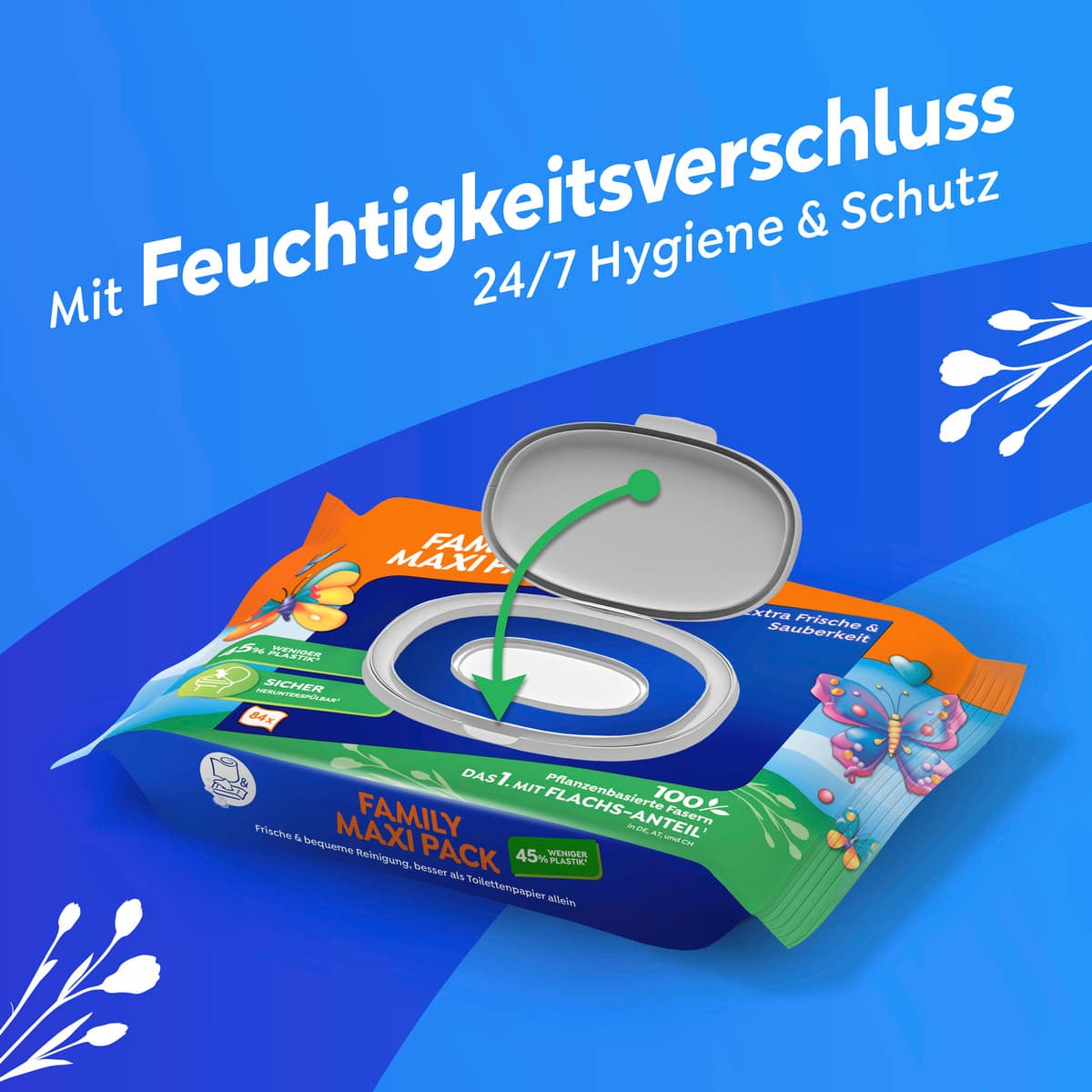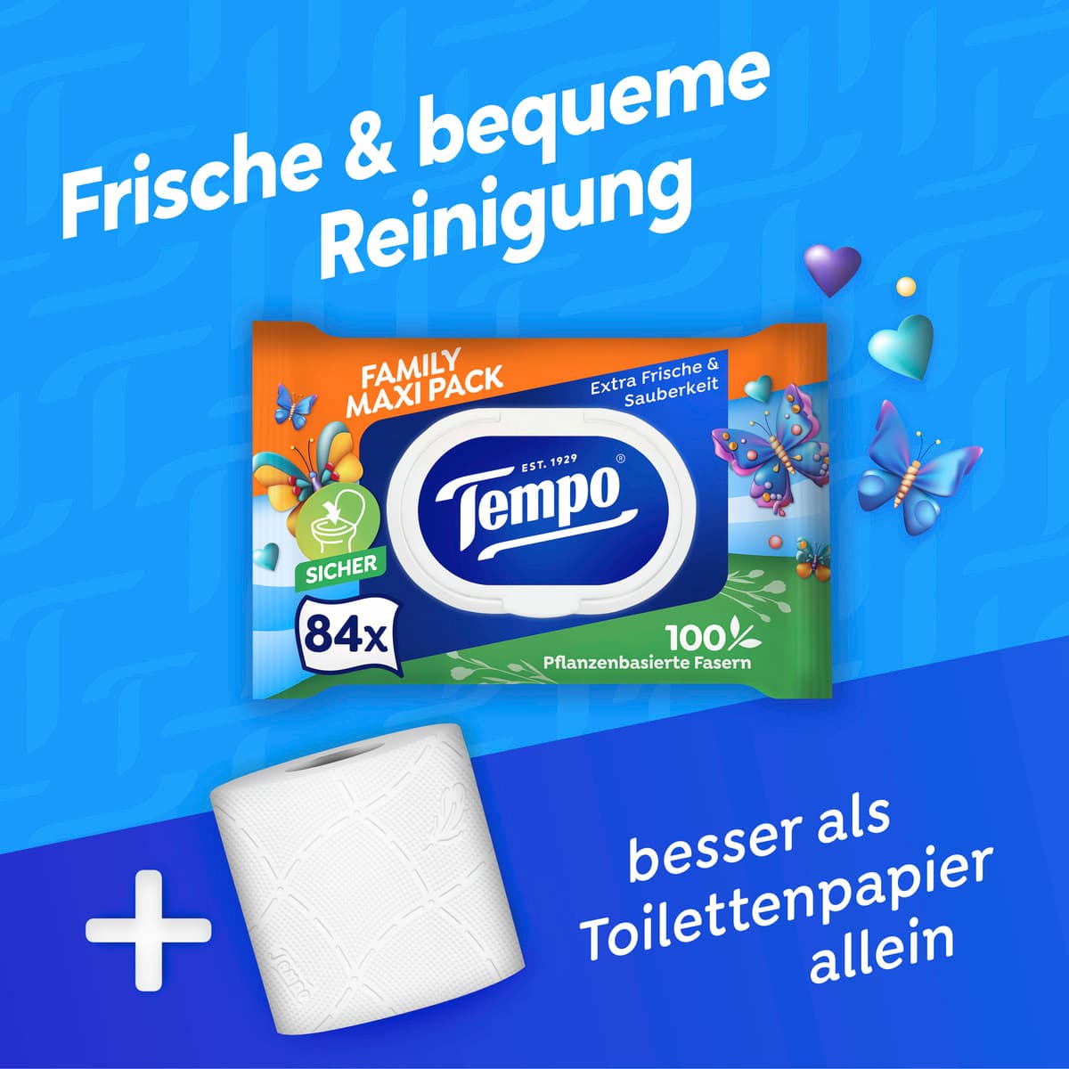 Tempo Feuchte Toilettentücher kombinieren zuverlässige Stärke und sanfte Reinigung. Die plastikfreien, herunterspülbaren Tücher reinigen hygienischer als trockenes Toilettenpapier allein und sind sanft zu Ihrer Haut. Mit die Varianten erfüllen Tempo feuchte Toilettentücher all Ihre verschiedenen Bedürfnisse. Sie fühlen sich erfrischt und gepflegt, während Sie das gleiche sanfte Tempo-Gefühl haben, das Sie kennen und lieben. Tempo Feuchte Toilettentücher werden aus 100% pflanzenbasierten Fasern mit Flachsanteil hergestellt und wurden entwickelt, um Druck von den Wäldern zu nehmen und so etwas für unseren Planeten zu tun. Die plastikfreien Tücher können genau wie trockenes Toilettenpapier heruntergespült werden und sind sicher herunterspülbar ähnlich wie trockenes Toilettenpapier. Tempo Feuchte Toilettentücher sind dermatologisch getestet und auch für sensible Haut geeignet. Integriere die perfekte 2-Schritte-Reinigung aus trockenem Toilettenpapier und Tempo Feuchte Toilettentücher in deinen Hygiene-Alltag und fühle dich jedes Mal verlässlich frisch. Die recycelbare Verpackung*** von Tempo Feuchte Toilettentücher ist mit einem Feuchtigkeitsverschluss ausgestattet, durch den die Blätter feucht und hygienisch bleiben.