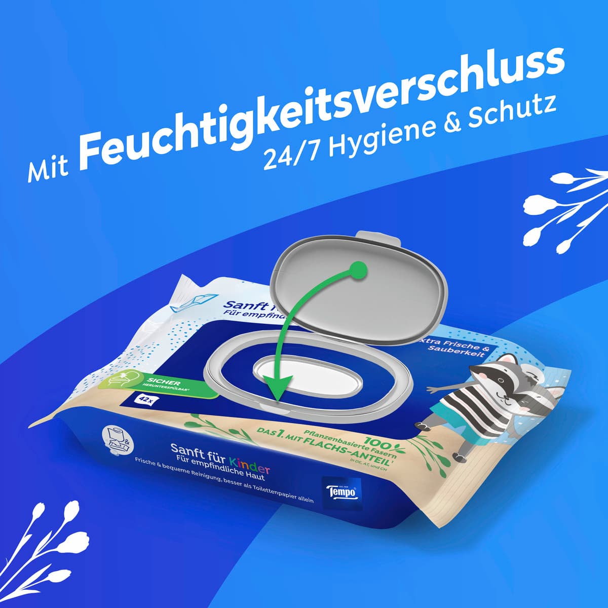Tempo Feuchte Toilettentücher werden aus 100% pflanzenbasierten Fasern mit Flachsanteil hergestellt und wurden entwickelt, um Druck von den Wäldern zu nehmen und so etwas für unseren Planeten zu tun. Die plastikfreien Tücher können genau wie trockenes Toilettenpapier sicher heruntergespült werden. Tempo Feuchte Toilettentücher sind dermatologisch getestet und auch für sensible Haut geeignet. Integriere die perfekte 2-Schritte-Reinigung aus trockenem Toilettenpapier und Tempo Feuchte Toilettentücher in deinen Hygiene-Alltag und fühle dich jedes Mal verlässlich frisch. Die recycelbare Verpackung*** von Tempo Feuchte Toilettentücher ist mit einem Feuchtigkeitsverschluss ausgestattet, durch den die Blätter feucht und hygienisch bleiben.