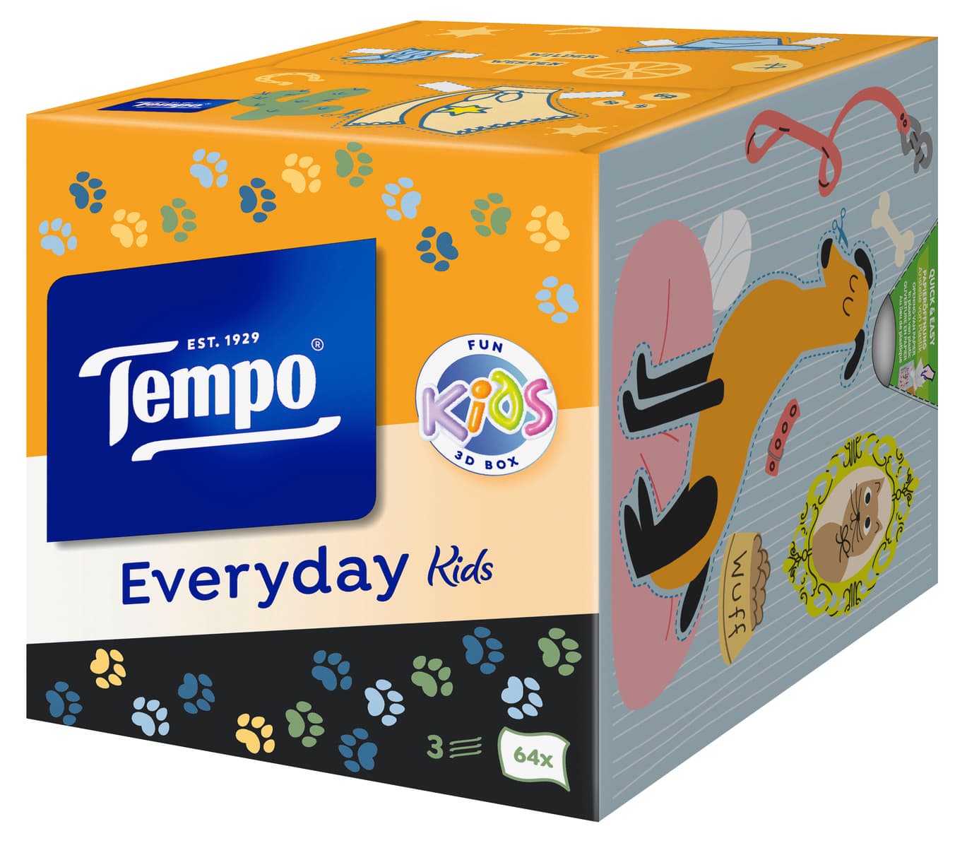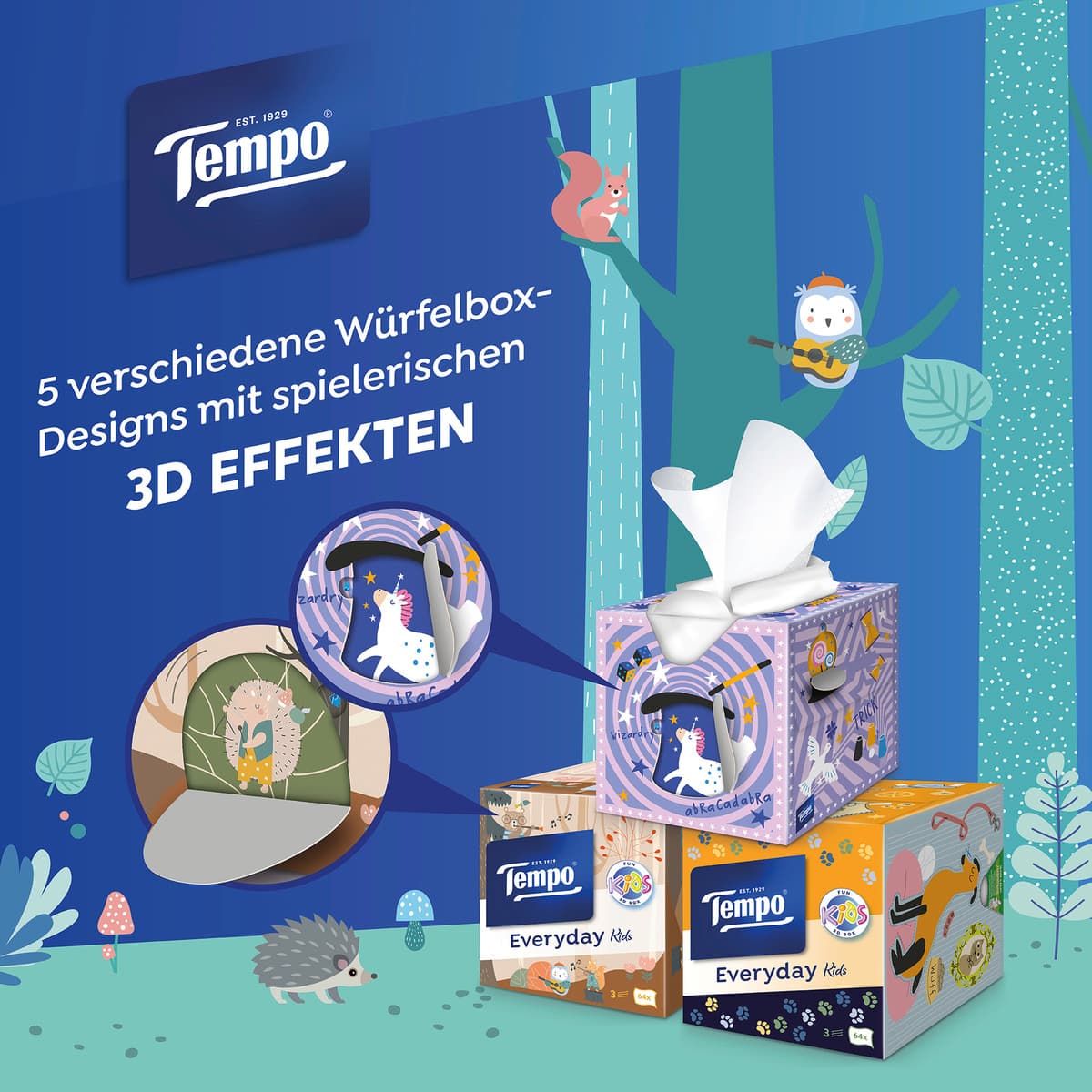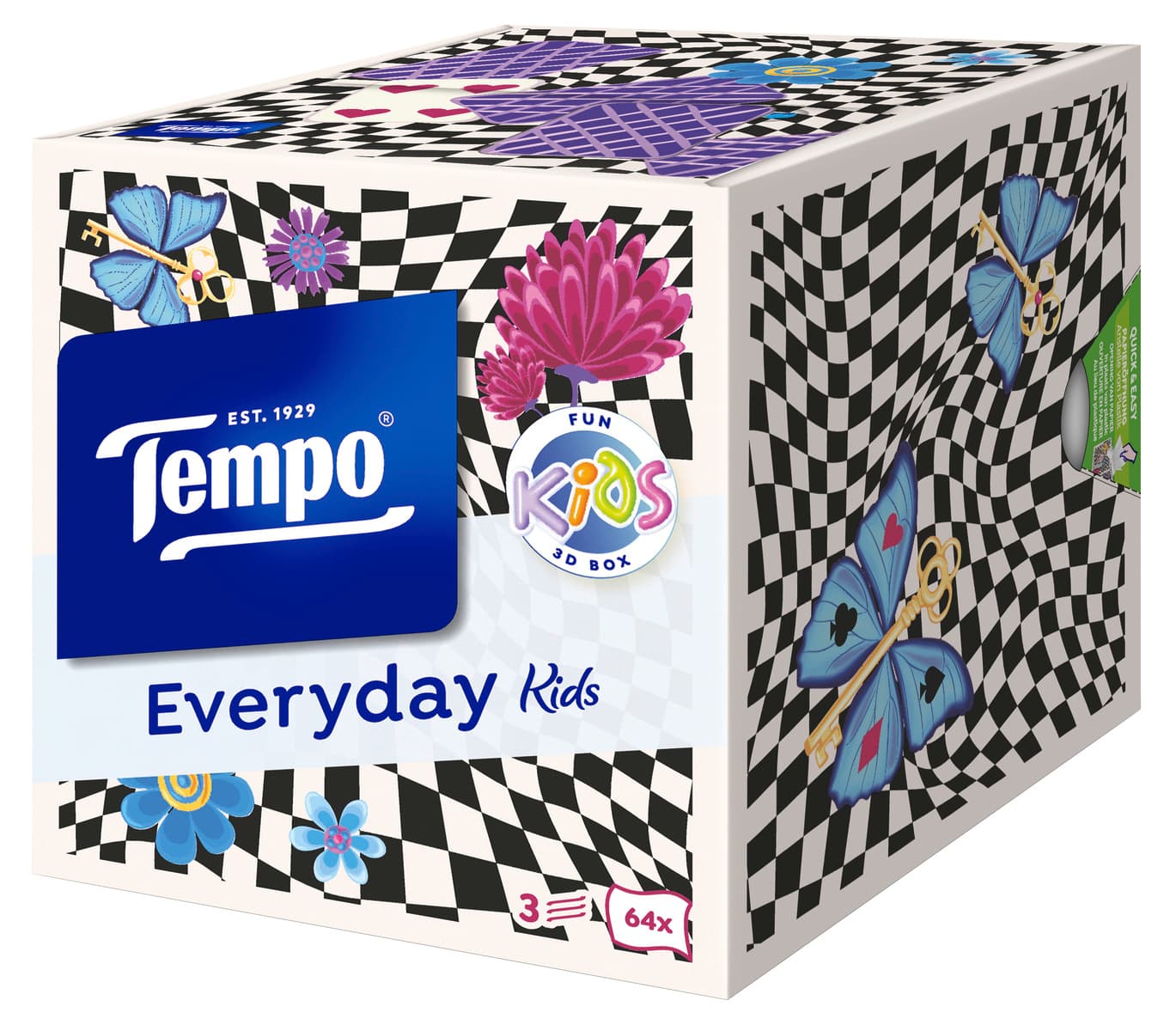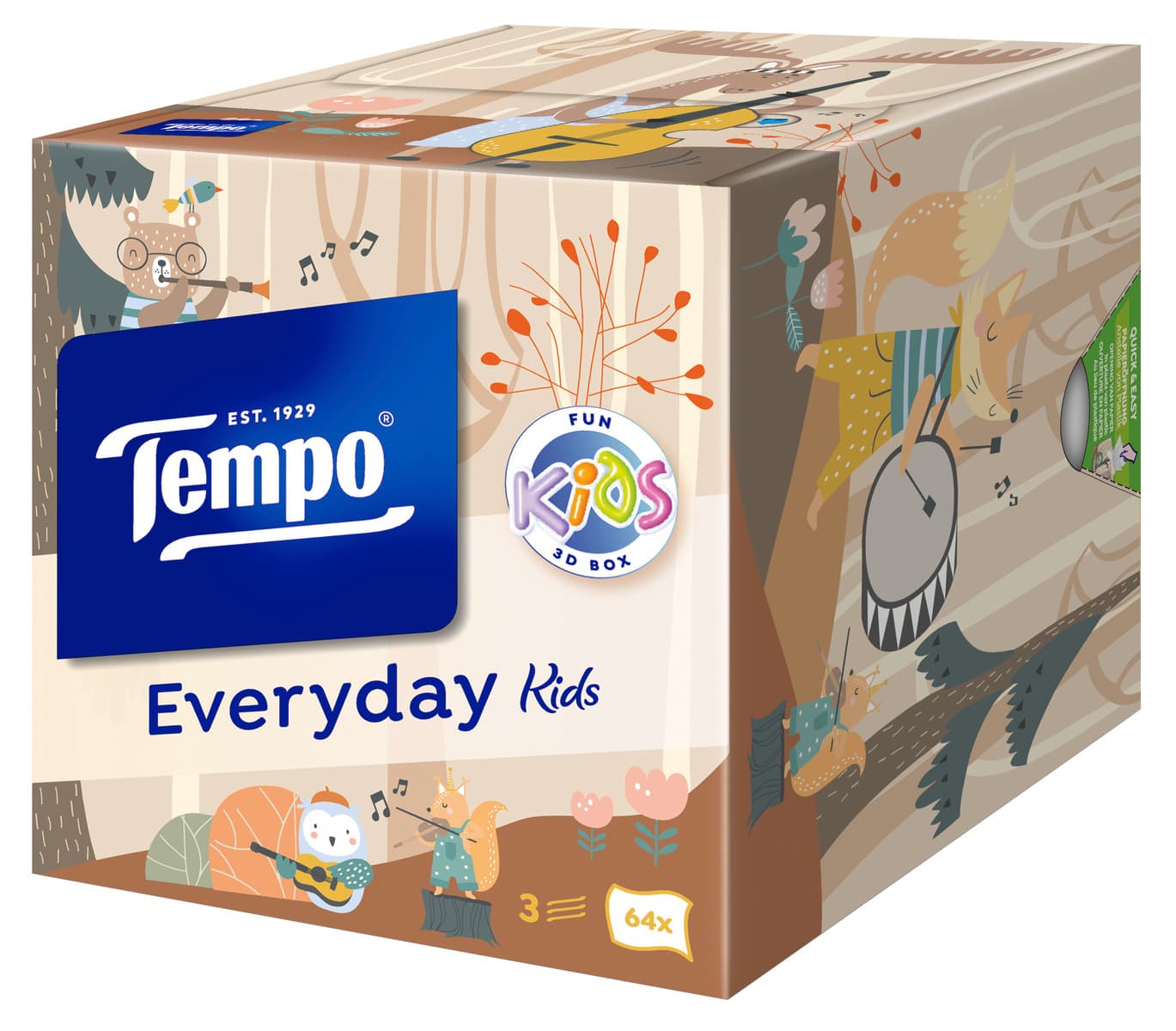 Tempo Everyday Kids Box Ob laufende Nase, Allergien oder kleine Missgeschicke – mit der Tempo Everyday Kids Box ist schnelle Hilfe immer griffbereit. Die praktischen Papiertücher mit Quick & Easy Öffnung lassen sich kinderleicht entnehmen und sind ideal für den Alltag. Die 3-lagigen Taschentücher sind besonders weich und gleichzeitig stark – genau das Richtige für junge, empfindliche Nasen. In fünf verspielten Designs mit einzigartigen 3D-Effekten sorgt die Box für extra Spaß und Abwechslung. Natürlich überzeugt die Tempo Everday Kids Box mit der gewohnten Tempo-Qualität: Weich & Stark - perfekt für die ganze Familie. Zusätzlich achten wir auf Nachhaltigkeit: Die Verpackung hat eine Papieröffnung und ist recycelbar*. Die Verpackung ist recycelbar gemäß den Vorgaben der EN 13430 (CH: SN EN 13430). Es verbleibt eine geringe Menge an nicht recycelbaren Rückständen. Der Karton ist mit mindestens 70% recycelten Fasern hergestellt.