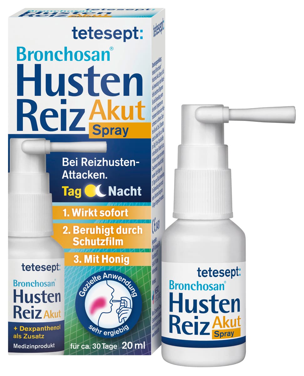 tetesept Bronchosan® Hustenreiz Akut Spray lindert lästigen Hustenreiz und Reizhusten-Attacken schnell und effektiv. Es ist ideal für unterwegs und in der Nacht. Das Spray mit wirksamer Honig-Rezeptur bildet einen dünnen Schutzfilm auf der gereizten Rachenschleimhaut aus. Dieser entfaltet eine befeuchtende und beruhigende Wirkung. Der Hustenreiz lässt spürbar nach. Zusätzlich wird die Schleimhaut geschützt. Der spezielle Sprühapplikator ermöglicht eine gezielte Anwendung. tetesept Bronchosan® Hustenreiz Akut Spray bietet eine wirksame Sofort-Hilfe bei trockenem Reizhusten. tetesept Bronchosan® Hustenreiz Akut Spray bietet eine wirksame Sofort-Hilfe bei trockenem Reizhusten: 1. Lindert Hustenreiz und akute Reizhusten-Attacken. 2. Beruhigt, befeuchtet und schützt die gereizte Rachen-schleimhaut. 3. Enthält Dexpanthenol als Zusatz. √ Auch für Kinder ab 5 Jahren.