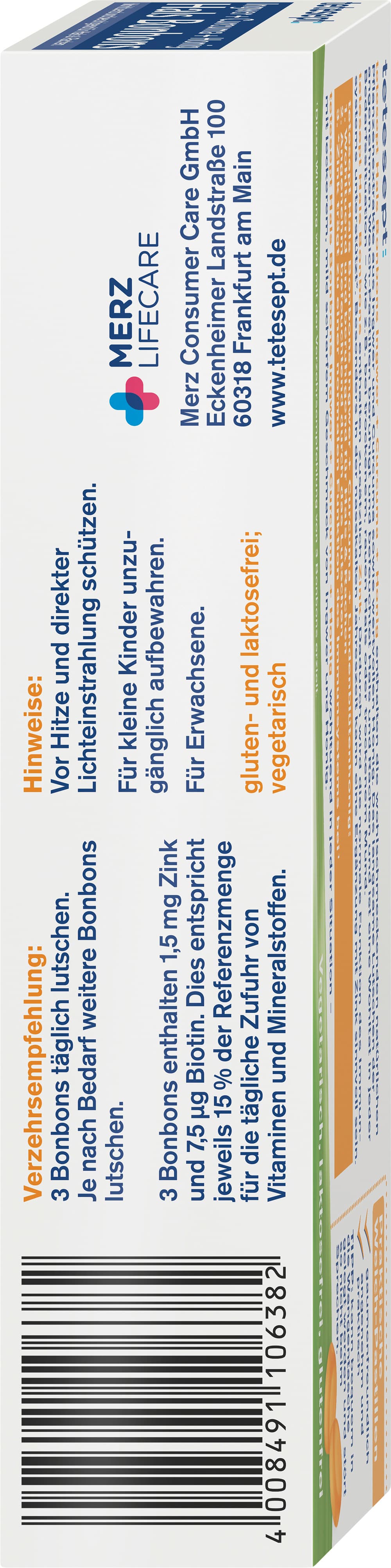 AnwendungshinweisVerzehrsempfehlung: 3 Bonbons täglich lutschen. Je nach Bedarf weitere Bonbons lutschen. 3 Bonbons enthalten 1,5 mg Zink und 7,5 μg Biotin. Dies entspricht jeweils 15% der Referenzmenge für die tägliche Zufuhr von Vitaminen und Mineralstoffen. Für Erwachsene