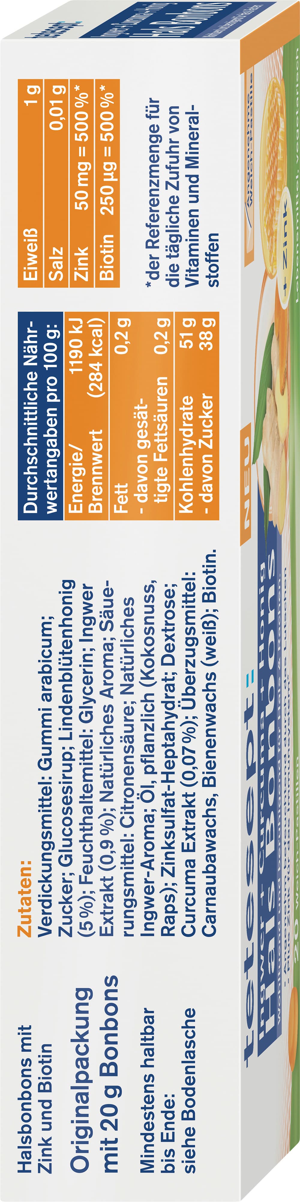 Inhaltsstoffe Verdickungsmittel: Gummi arabicum; Zucker; Glucosesirup; Lindenblütenhonig (5%); Feuchthaltemittel: Glycerin; Ingwer Extrakt (0,9%); Natürliches Aroma; Säuerungsmittel: Citronensäure; Natürliches Ingwer-Aroma; Öl, pflanzlich (Kokosnuss, Raps); Zinksulfat-Heptahydrat; Dextrose; Curcuma Extrakt (0,07%); Überzugsmittel: Carnaubawachs, Bienenwachs (weiß); Biotin.