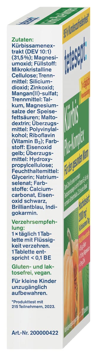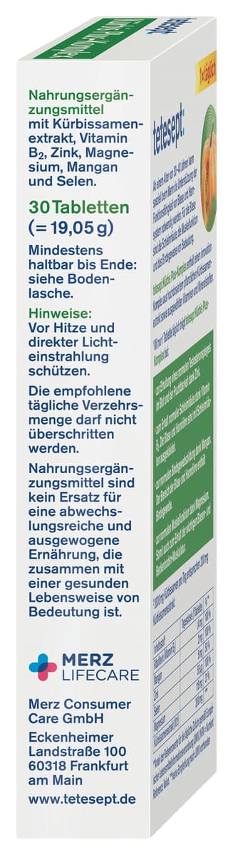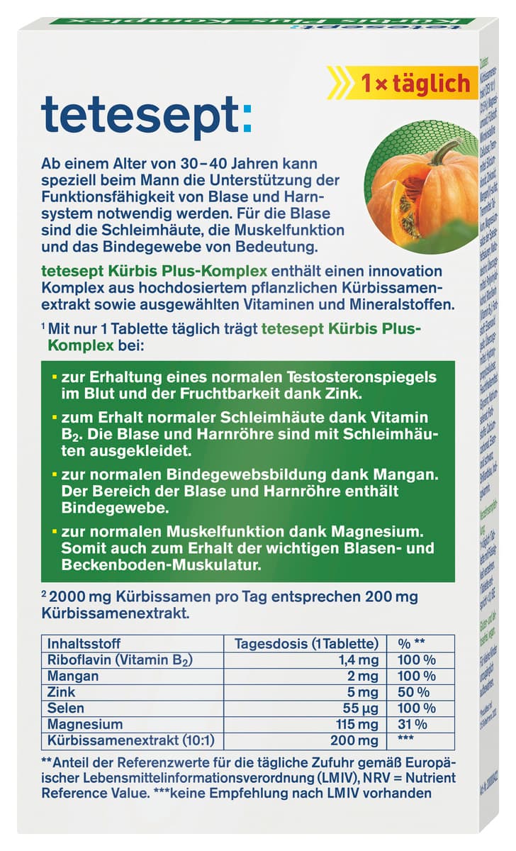Ab einem Alter von 30– 40 Jahren kann speziell beim Mann die Unterstützung der Funktionsfähigkeit von Blase und Harn- system notwendig werden. Für die Blase sind die Schleimhäute, die Muskelfunktion und das Bindegewebe von Bedeutung. tetesept Kürbis Plus-Komplex enthält einen innovation Komplex aus hochdosiertem pflanzlichen Kürbissamen-extrakt sowie ausgewählten Vitaminen und Mineralstoffen.1Mit nur 1 Tablette täglich trägt tetesept Kürbis Plus-Komplex bei: • zur Erhaltung eines normalen Testosteronspiegels im Blut und der Fruchtbarkeit dank Zink. • zum Erhalt normaler Schleimhäute dank Vitamin B2. Die Blase und Harnröhre sind mit Schleimhäuten ausgekleidet. • zur normalen Bindegewebsbildung dank Mangan. Der Bereich der Blase und Harnröhre enthält Bindegewebe. • zur normalen Muskelfunktion dank Magnesium. Somit auch zum Erhalt der wichtigen Blasen- und Beckenboden-Muskulatur