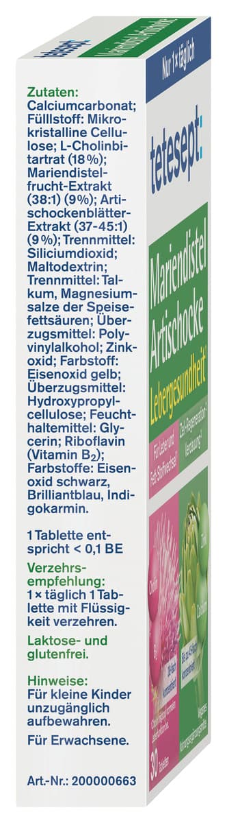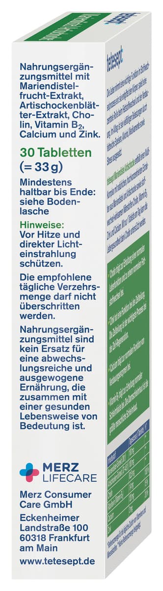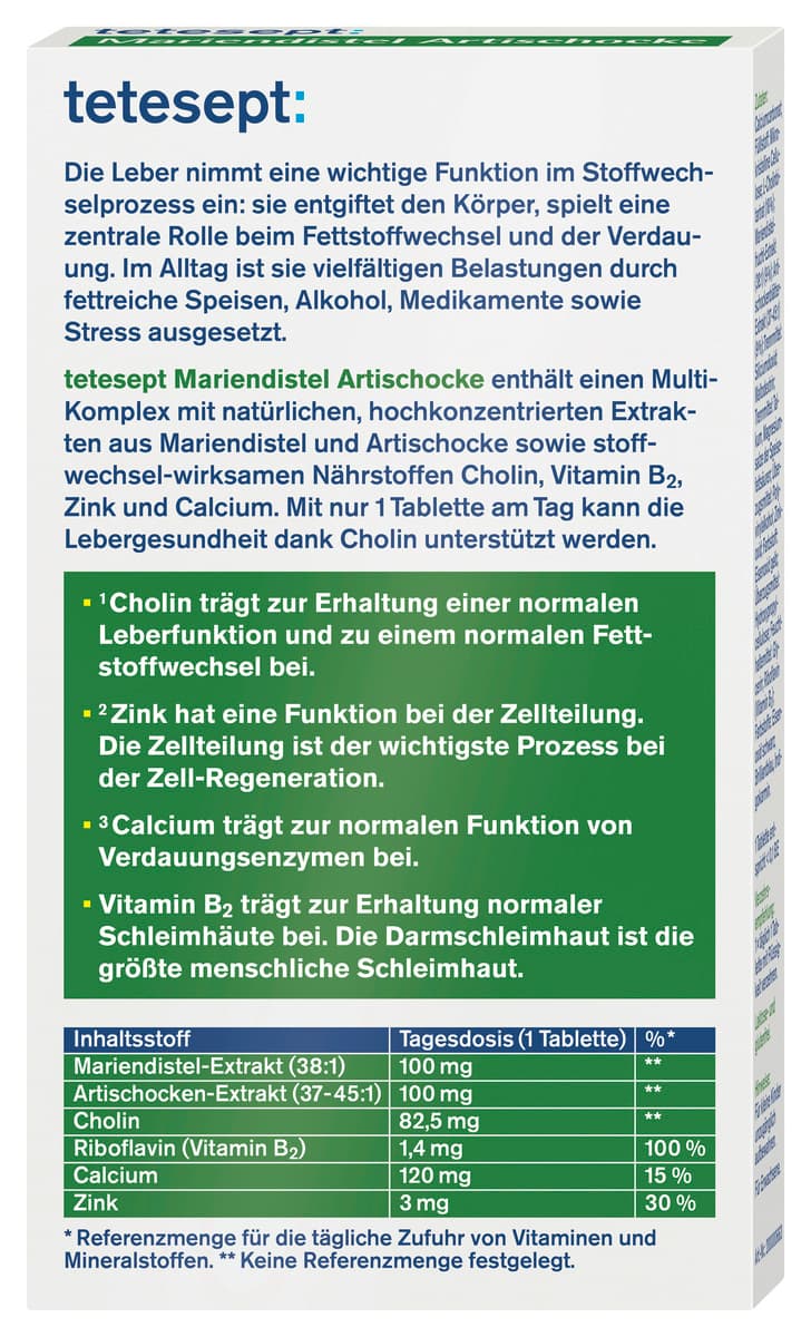 Die Leber nimmt eine wichtige Funktion im Stoffwechselprozess ein: sie entgiftet den Körper, spielt einezentrale Rolle beim Fettstoffwechsel und der Verdauung.Im Alltag ist sie vielfältigen Belastungen durchfettreiche Speisen, Alkohol, Medikamente sowieStress ausgesetzt.tetesept Mariendistel Artischocke enthält einen Multi-Komplex mit natürlichen, hochkonzentrierten Extraktenaus Mariendistel und Artischocke sowie stoffwechsel-wirksamen Nährstoffen Cholin, Vitamin B2,Zink und Calcium. Mit nur 1 Tablette am Tag kann dieLebergesundheit dank Cholin unterstützt werden.-1Cholin trägt zur Erhaltung einer normalenLeberfunktion und zu einem normalen Fettstoffwechselbei.•-2Zink hat eine Funktion bei der Zellteilung.Die Zellteilung ist der wichtigste Prozess beider Zell-Regeneration.• 3Calcium trägt zur normalen Funktion vonVerdauungsenzymen bei.• Vitamin B2 trägt zur Erhaltung normalerSchleimhäute bei. Die Darmschleimhaut ist diegrößte menschliche Schleimhaut.