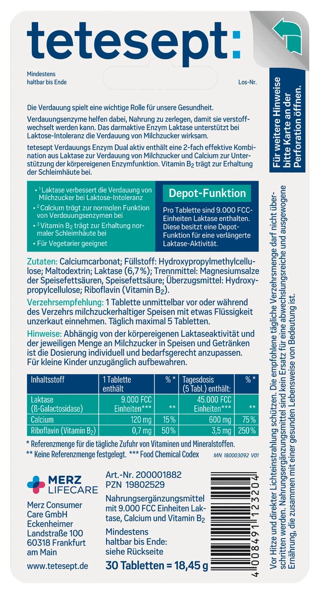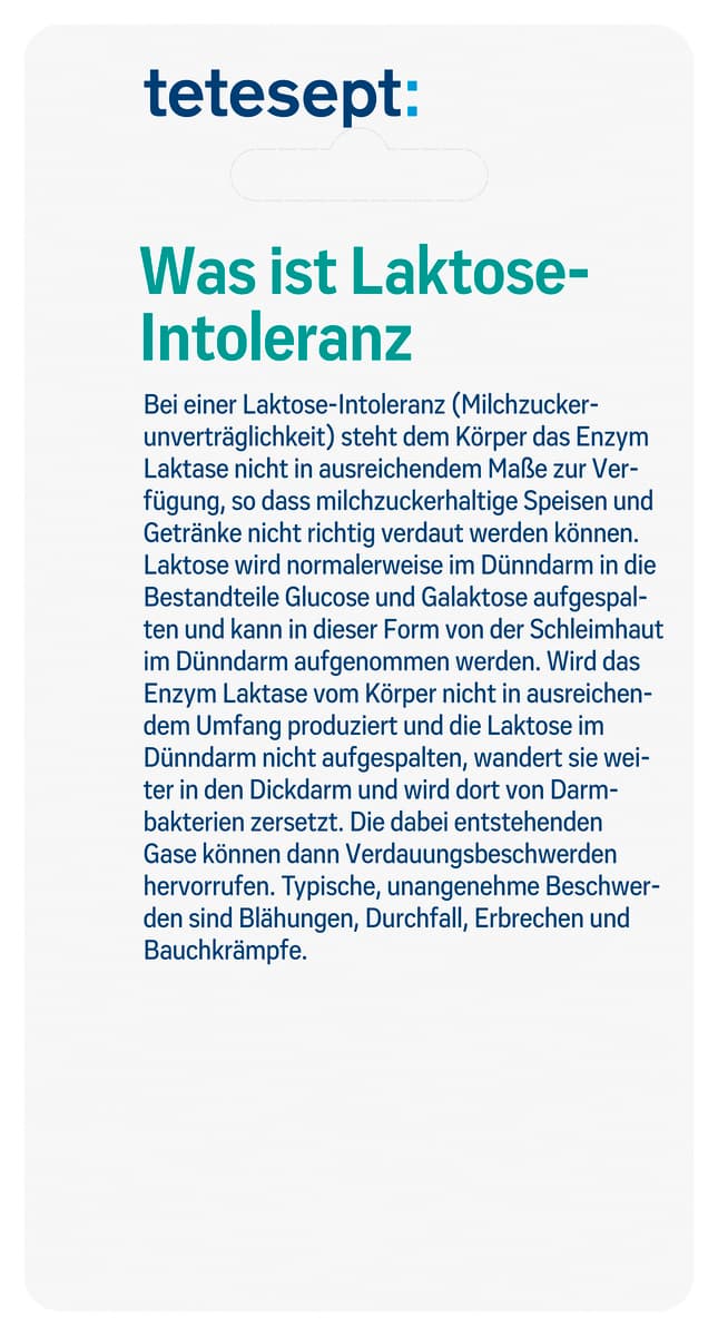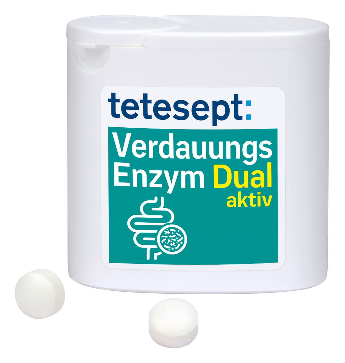 Die Verdauung spielt eine wichtige Rolle für unsere Gesundheit. Verdauungsenzyme helfen dabei, Nahrung zu zerlegen, damit sie verstoffwechselt werden kann. Das darmaktive Enzym Laktase unterstützt bei Laktose-Intoleranz die Verdauung von Milchzucker wirksam. tetesept Verdauungs Enzym Dual aktiv enthält eine 2-fach effektive Kombination aus Laktase zur Verdauung von Milchzucker und Calcium zur Unterstützung der körpereigenen Enzymfunktion. Vitamin B2 trägt zur Erhaltung der Schleimhäute bei. • 1 Laktase verbessert die Verdauung von Milchzucker bei Laktose-Intoleranz • 2 Calcium trägt zur normalen Funktion von Verdauungsenzymen bei • 3 Vitamin B2 trägt zur Erhaltung normaler Schleimhäute bei • Für Vegetarier geeignet Depot-Funktion: Pro Tablette sind 9.000 FCC Einheiten Laktase enthalten. Diese besitzt eine Depot-Funktion für eine verlängerte Laktase-Aktivität.