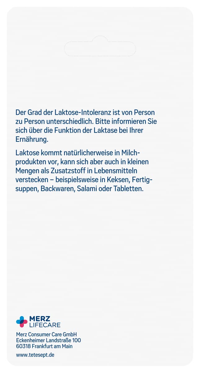 | Anwendungshinweis | 1 Tablette unmittelbar vor oder während des Verzehrs milchzuckerhaltiger Speisen mit etwas Flüssigkeit unzerkaut einnehmen. Täglich maximal 5 Tabletten. Die empfohlene tägliche Verzehrsmenge darf nicht überschritten werden. |