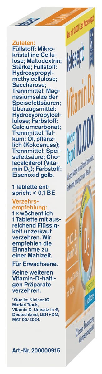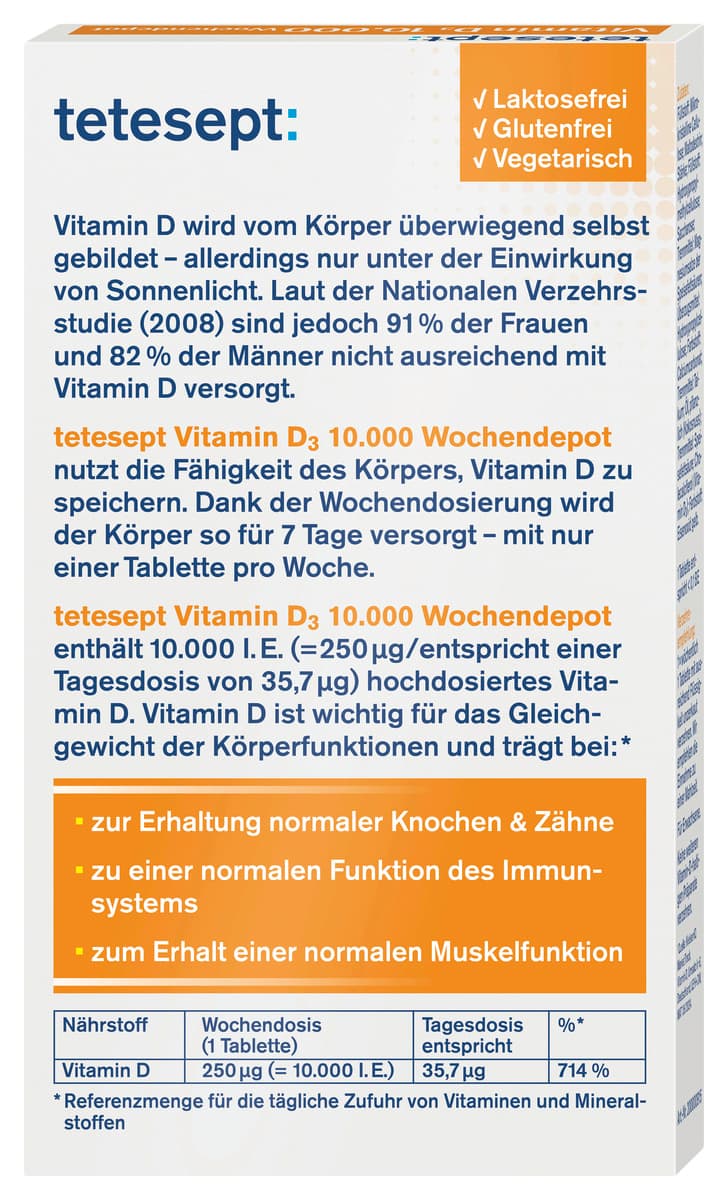 tetesept Vitamin D3 10000 Wochendepot ist ein Nahrungsergänzungsmittel zur Unterstützung bei einem Mangel an natürlichem Sonnenlicht für Knochen, Immunsystem und Muskeln. Es nutzt die Fähigkeit des Körpers, Vitamin D zu speichern. Dank der Wochendosierung von 10.000 I.E. (250 µg) Vitamin D3 wird der Körper so für 7 Tage versorgt – mit nur einer Tablette pro Woche.