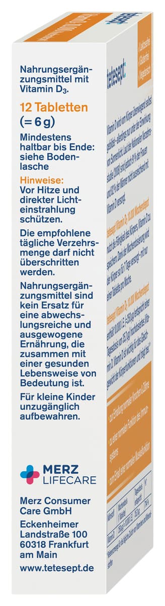 InhaltsstoffeFüllstoff: Mikrokristalline Cellulose; Maltodextrin; Stärke; Füllstoff: Hydroxypropylmethylcellulose; Saccharose; Trennmittel: Magnesiumsalze der Speisefettsäuren; Überzugsmittel: Hydroxypropylcellulose; Farbstoff: Calciumcarbonat; Trennmittel: Talkum; Öl, pflanzlich (Kokosnuss); Trennmittel: Speisefettsäure; Cholecalciferol (Vitamin D3); Farbstoff: Eisenoxid gelb.