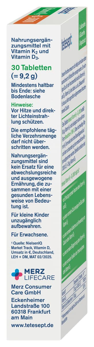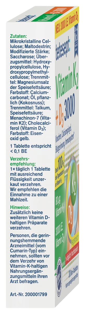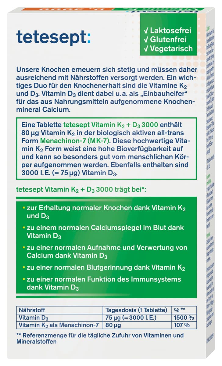tetesept Vitamin K2 + D3 3000 trägt bei*: • zur Erhaltung normaler Knochen dank Vitamin K2 und D3 • zu einem normalen Calciumspiegel im Blut dank Vitamin D3 • zu einer normalen Aufnahme und Verwertung von Calcium dank Vitamin D3 • zu einer normalen Blutgerinnung dank Vitamin K2 • zu einer normalen Funktion des Immunsystems dank Vitamin D3