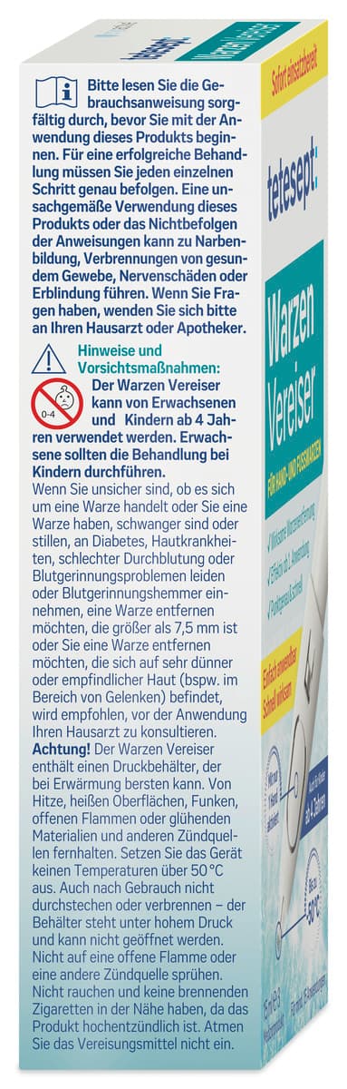Der Warzen Vereiser kann von Erwachsenen und Kindern ab 4 Jahren verwendet werden. Erwachsene sollten die Behandlung bei Kindern durchführen. Bitte lesen Sie die Gebrauchsanweisung sorgfältig durch, bevor Sie mit der Anwendung dieses Produkts beginnen. Für eine erfolgreiche Behandlung müssen Sie jeden einzelnen Schritt genau befolgen. Eine unsachgemäße Verwendung dieses Produkts oder das Nichtbefolgen der Anweisungen kann zu Narbenbildung, Verbrennungen von gesundem Gewebe, Nervenschäden oder Erblindung führen. Wenn Sie Fragen haben, wenden Sie sich bitte an Ihren Hausarzt oder Apotheker. Verwenden Sie den Warzen Vereiser nur direkt auf der Warze. Bei der Anwendung auf gesunder Haut oder auf der die Warze umgebenen Haut, kann ein Stechen, leichtes Brennen oder ein schmerzhaftes Gefühl an der behandelten Stelle auftreten, was zu brennenden Wunden, Hautschäden oder Narben führen kann.