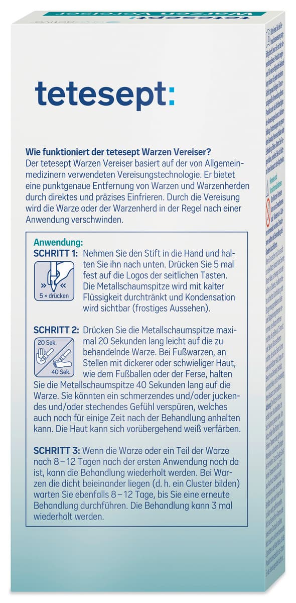 Der tetesept Warzen Vereiser für Hand- und Fußwarzen basiert auf der von Allgemeinmedizinern verwendeten Vereisungstechnologie. Er bietet eine punktgenaue Entfernung von Warzen und Warzenherden durch direktes und präzises Einfrieren.
