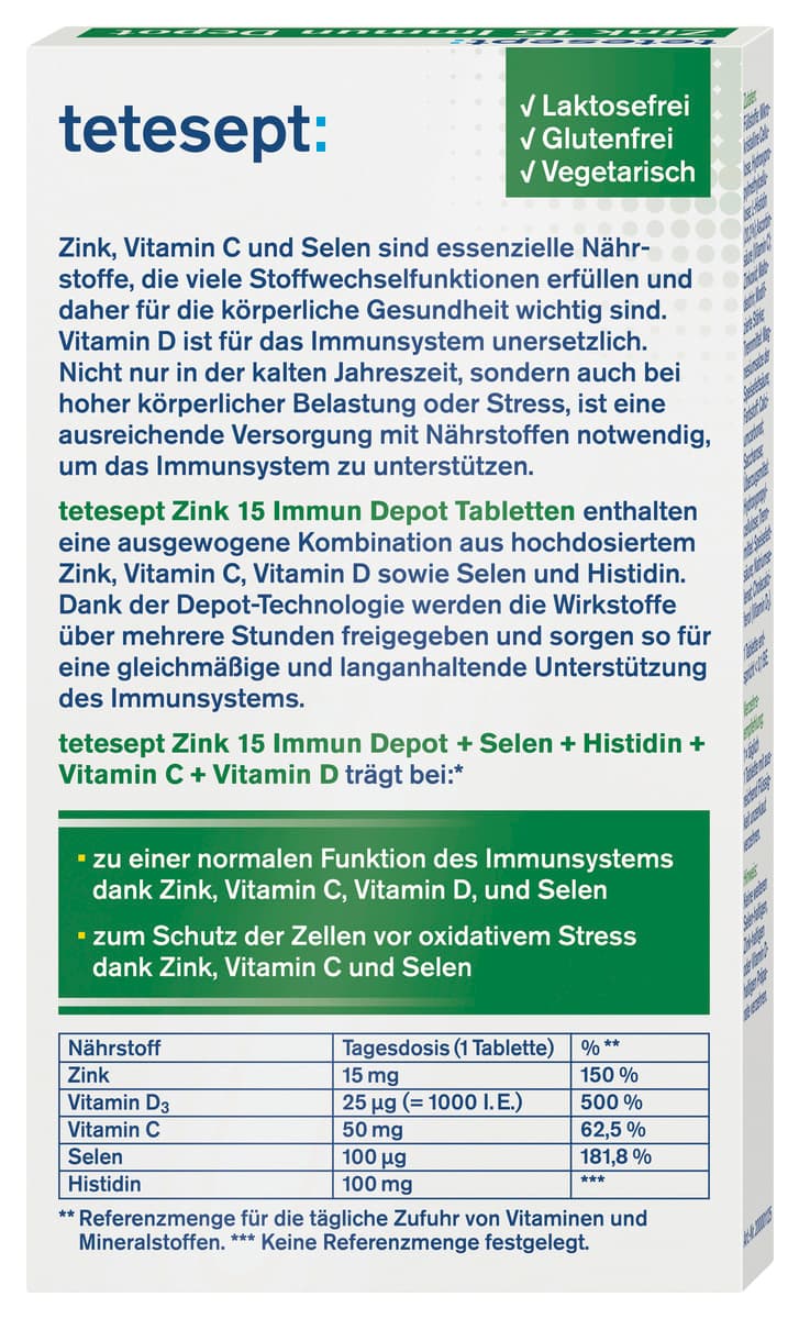 tetesept Zink 15 Immun Depot ist ein Nahrungsergänzungsmittel zur Unterstützung der Abwehrkräfte, des Immunsystems und des oxidativen Zellschutzes. Es enthält eine ausgewogene Kombination aus hochdosiertem Zink, Vitamin C, Vitamin D sowie Selen und Histidin. Dank der Depot-Technologie werden die Wirkstoffe über mehrere Stunden freigegeben und sorgen so für eine gleichmäßige und langanhaltende Unterstützung des Immunsystems.