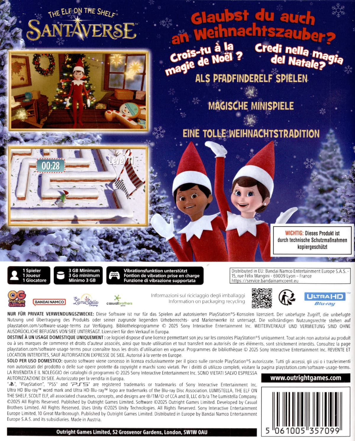 Glaubst du an Weihnachtszauber? Prima, denn um Weihnachten zu retten, braucht Santa einen Sack voller Magie! Die Vorfreude lässt langsam nach und am Nordpol herrscht nicht gerade Festtagsstimmung. Santas Schlitten fliegt nicht, die Geschenke sind noch nicht verpackt und Santas Namensliste mit allen braven Kindern ist noch nicht fertig. Aber das wird sich jetzt ändern! Mit dir an Santas Seite steht einer festlichen Mission nichts mehr im Weg. Erster Halt: die Schule der Pfadfinderelfen. Um ein "offizieller Pfadfinderelf" zu werden, braucht es Schwung, Elan und Geschicklichkeit, um magische Herausforderungen zu meistern. Ab und zu wird es knifflig, aber vor allem wird es ein lustiges und spannendes Abenteuer! Wie es bei The Elf on the Shelf bereits Tradition ist, erwarten dich eine neue Familie und dein Pfadfinderelf-Name zusammen mit einem perfekten Festtagsoutfit mit glitzernden saisonalen Accessoires, die alle Blicke auf dich ziehen! Als offizieller Pfadfinderelf ist man nicht an einen bestimmten Ort gebunden, sondern verbreitet Weihnachtsstimmung, erkundet alle Zimmer und fliegt durch die Küche über den Hinterhof und zurück zum Nordpol, während man Nussknackern, schwingenden Weihnachtskugeln und allerlei Hindernissen ausweicht. In dieser Jahreszeit dreht sich alles darum, für fröhliche und festliche Stimmung zu sorgen und Santa dabei zu helfen, Kindern auf der ganzen Welt eine Freude zu bereiten! Und dafür braucht er Weihnachtshelden! FEATURES: • EINE TOLLE WEIHNACHTSTRADITION: Die Geschichte und die Minispiele bieten Spaß für alle, denn die Weihnachtsstimmung ist in vollem Gange! • ALS PFADFINDERELF SPIELEN: Nach dem Training braucht Santa Hilfe mit seiner Namensliste aller braven Kinder. Wer ist mit dabei? • MAGISCHE MINISPIELE: Es erwarten dich Puzzles, Karten, Schmuckspiele und verzauberte Labyrinthe. • SAMMELN & GLÄNZEN: Um Belohnungen zu sammeln, muss man rennen, springen und schwingen, um Weihnachtsstimmung zu verbreiten. Und solltest du ein Ziel verfehlen, geht's gleich wieder weiter! • INDIVIDUELL GESTALTETE ELFHELDEN: Das perfekte Weihnachtsoutfit mit glitzernden Accessoires passend zur Jahreszeit liegt schon bereit. Audio: English, French, Italian, German, EU Spanish, Latam Spanish, Dutch, Polish, Swedish Text: English, French, Italian, German, EU Spanish, Brazilian Portuguese, Latam Spanish, Dutch, Polish, Swedish, Norwegian, Danish, Finnish, Simplified Chinese, Traditional Chinese, Japanese, Korean