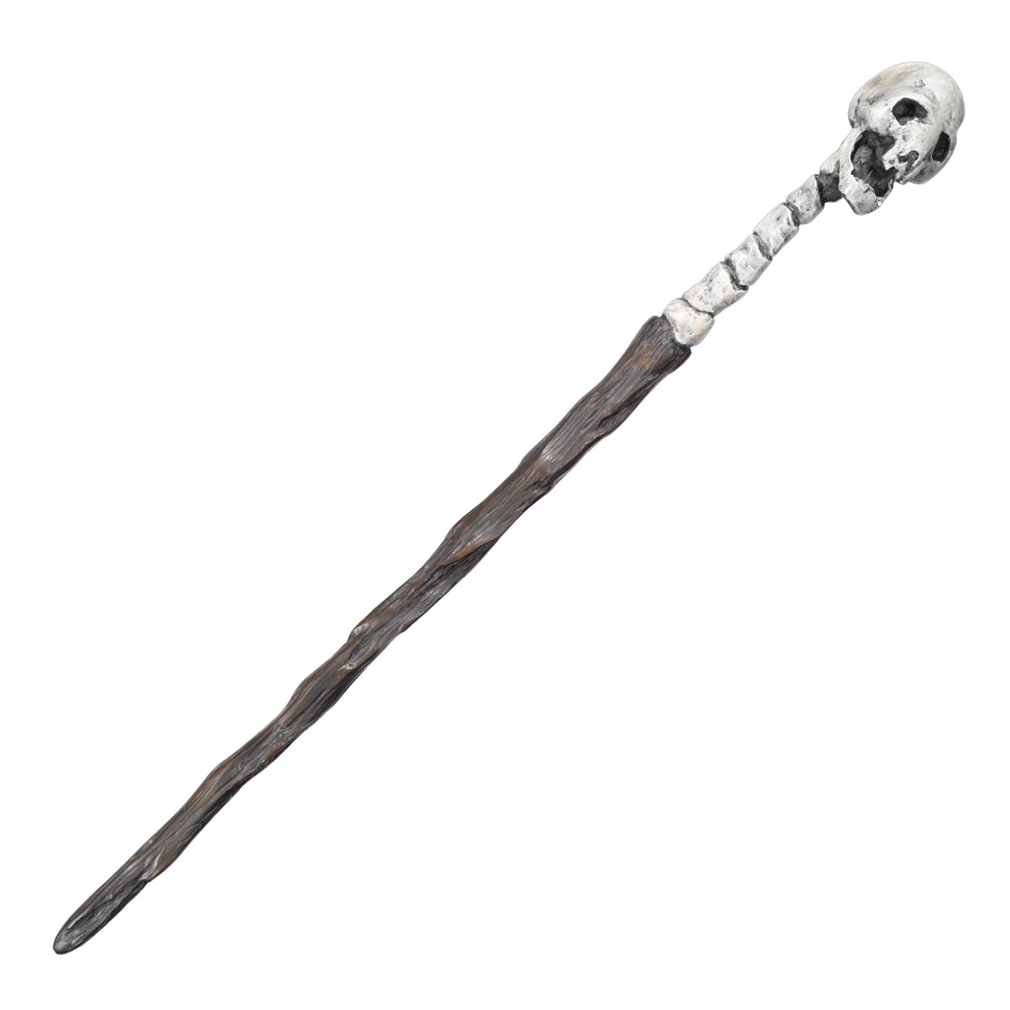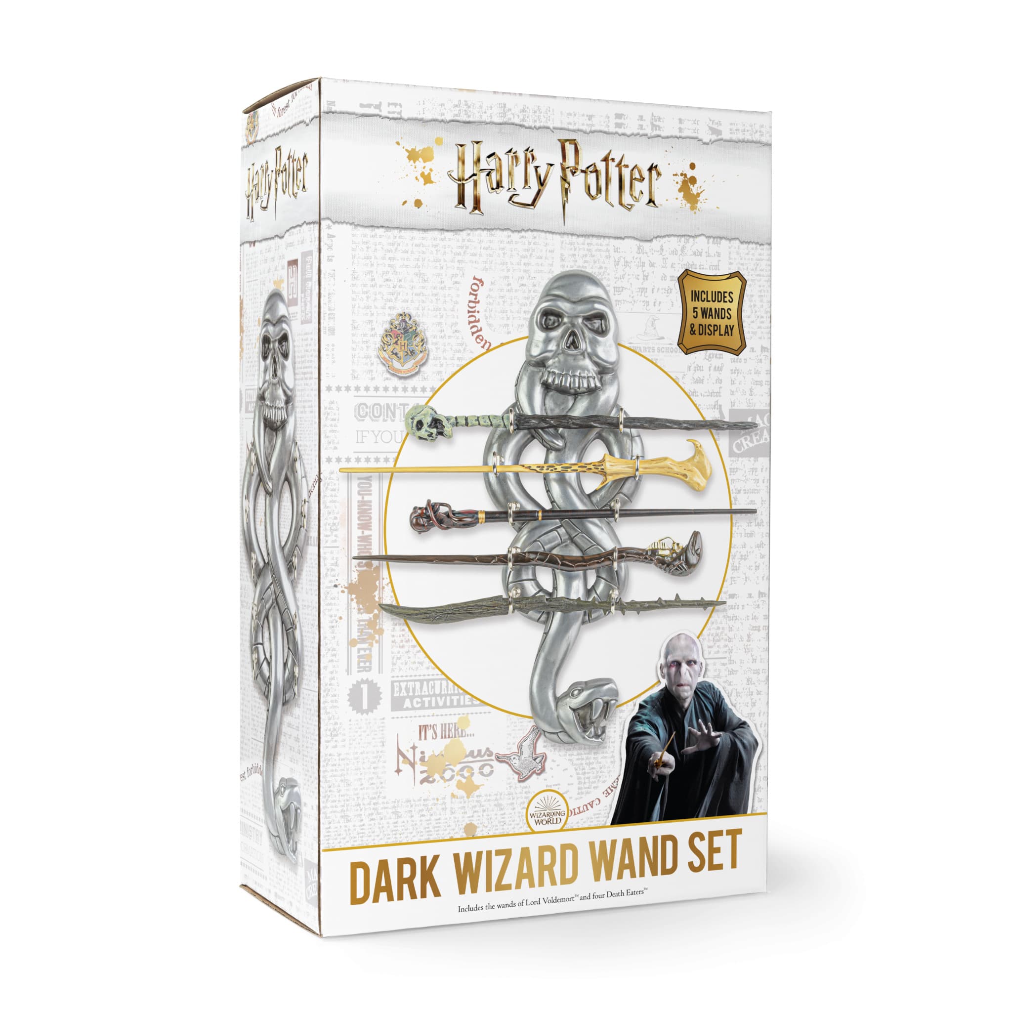Dieses bemalte Display aus Kunstharz beherbergt fünf Zauberstäbe der dunklen Magier: Lord Voldemort, Totenkopf des Todessers, Wirbel des Todessers, Schlange des Todessers und Dorn des Todessers.