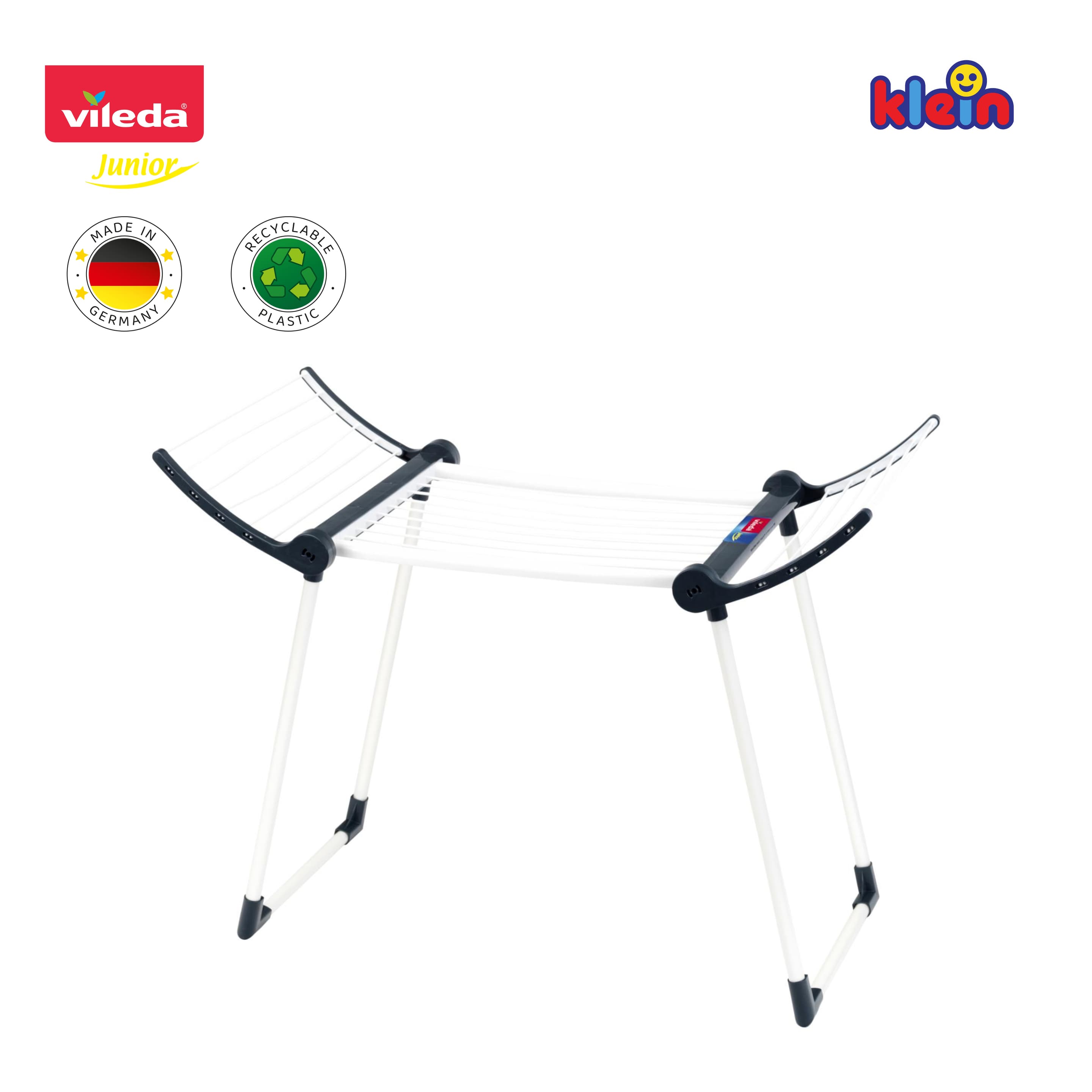 Mit einklappbaren Seitenteilen. Wenn der Teddy nass geworden ist oder die Puppenkleider frisch gewaschen sind, können die kleinen Mamas und Papas sie einfach selbst zum Trocknen aufhängen. Dabei fühlen sie sich ganz wie die Großen, denn der Trockenständer ist im bekannten Vileda-Design gebaut. Auch wenn er die Puppenausgabe des großen Vorbildes ist, so passen dennoch auch große Socken oder kleine T-Shirts darauf, so dass die Kinder spielerisch ihren Eltern im Haushalt helfen können. Diese Rollenspiele sind für Kinder besonders wichtig, auch weil sie damit ihre Geschicklichkeit und Motorik schulen.• Dieser Wäscheständer darf am Waschtag nicht fehlen, um Mama und Papa im Haushalt zu helfen• Der Trockenständer ist im beliebten Vileda-Design mit einklappbaren Seitenteilen gebaut• Der Wäscheständer bietet Platz für viele Puppenkleider oder nassgewordene Plüschtiere• Dieser praktische Haushaltshelfer im kindgerechten Spielformat fördert neben der Motorik auch das Rollenspiel und somit das Verständnis der Kinder für die Aufgaben der Erwachsenen• Made in Germany I Maße: 33 cm x 65 cm x 49,5 cm I Geeignet für Kinder ab drei Jahren