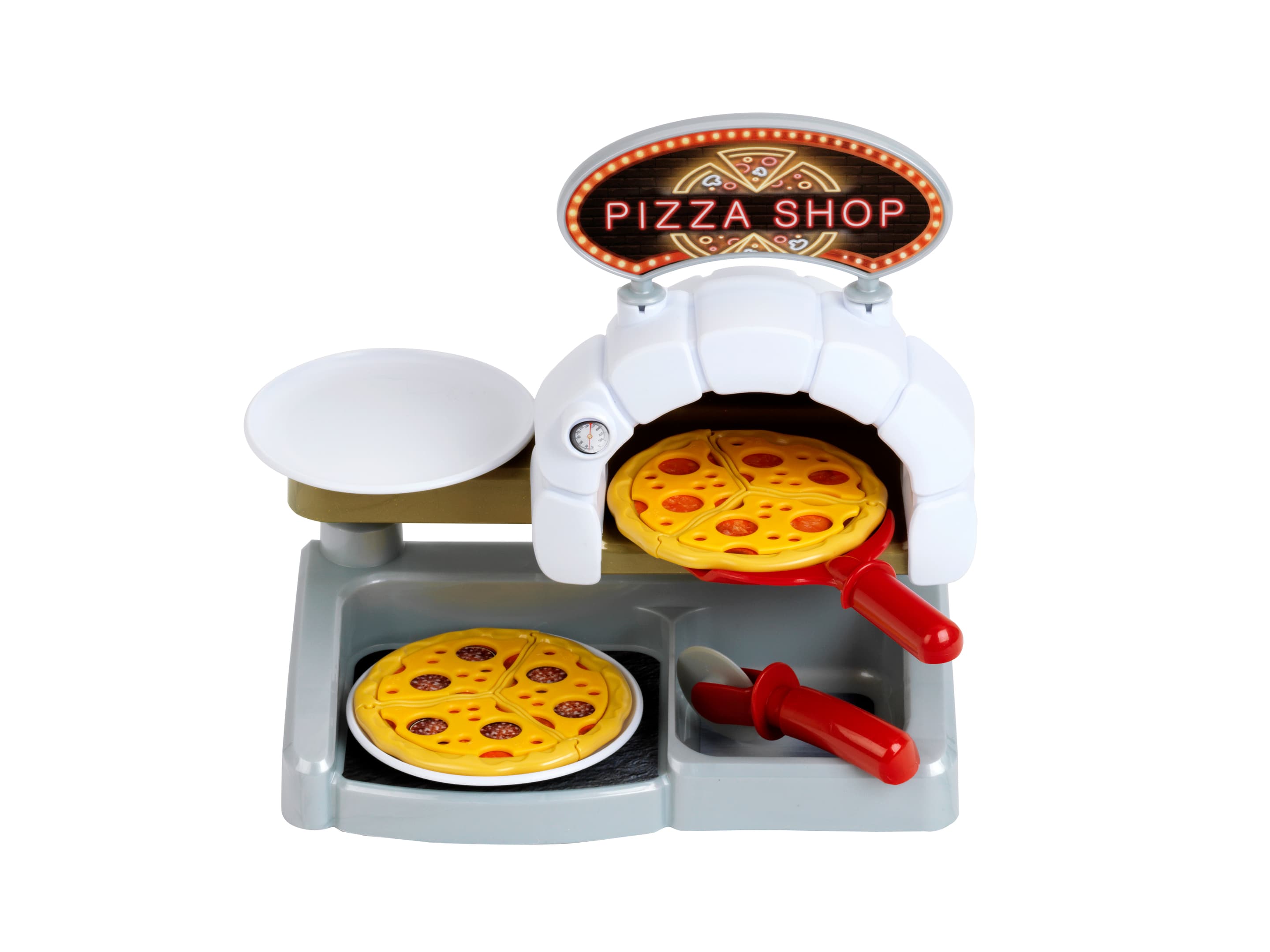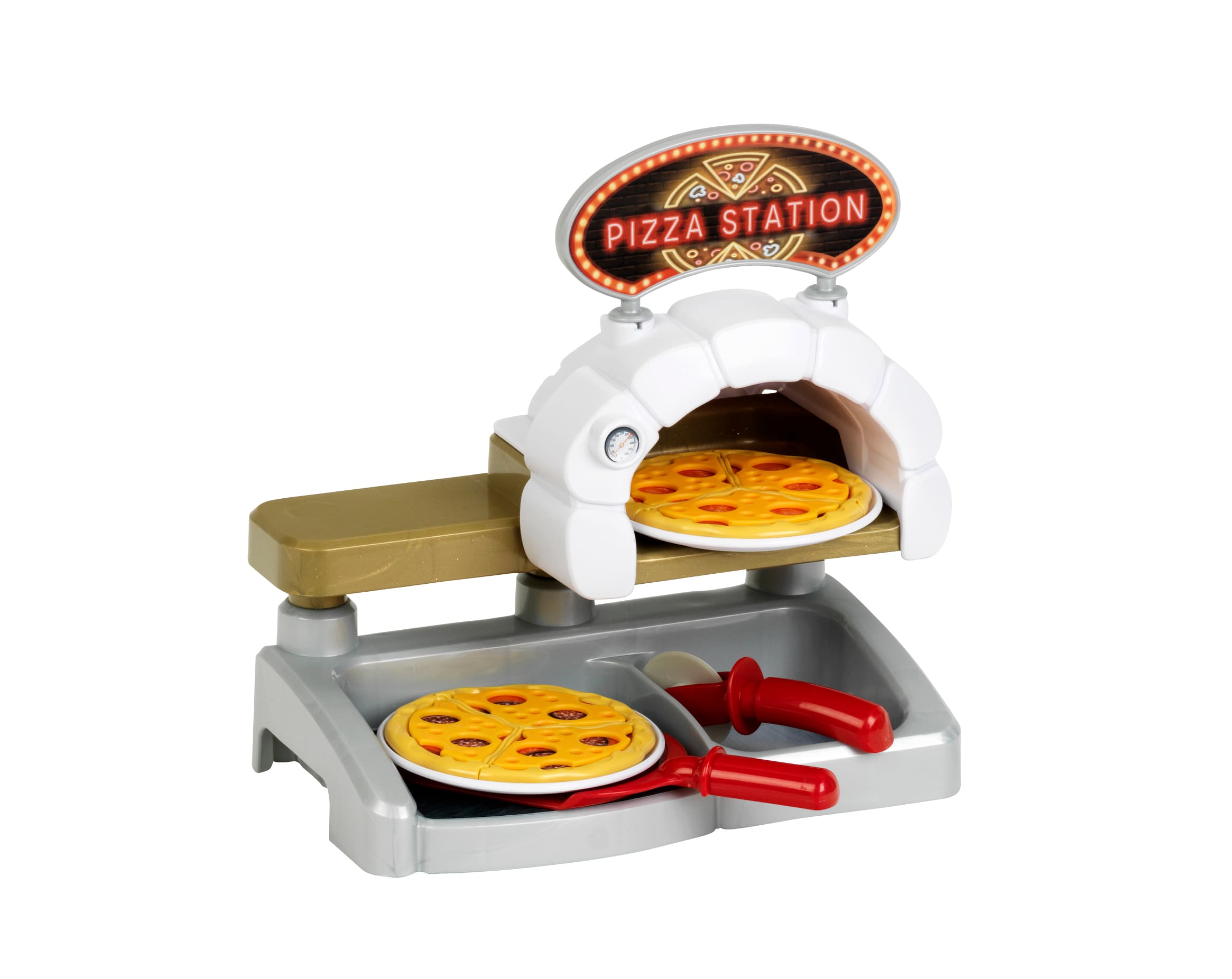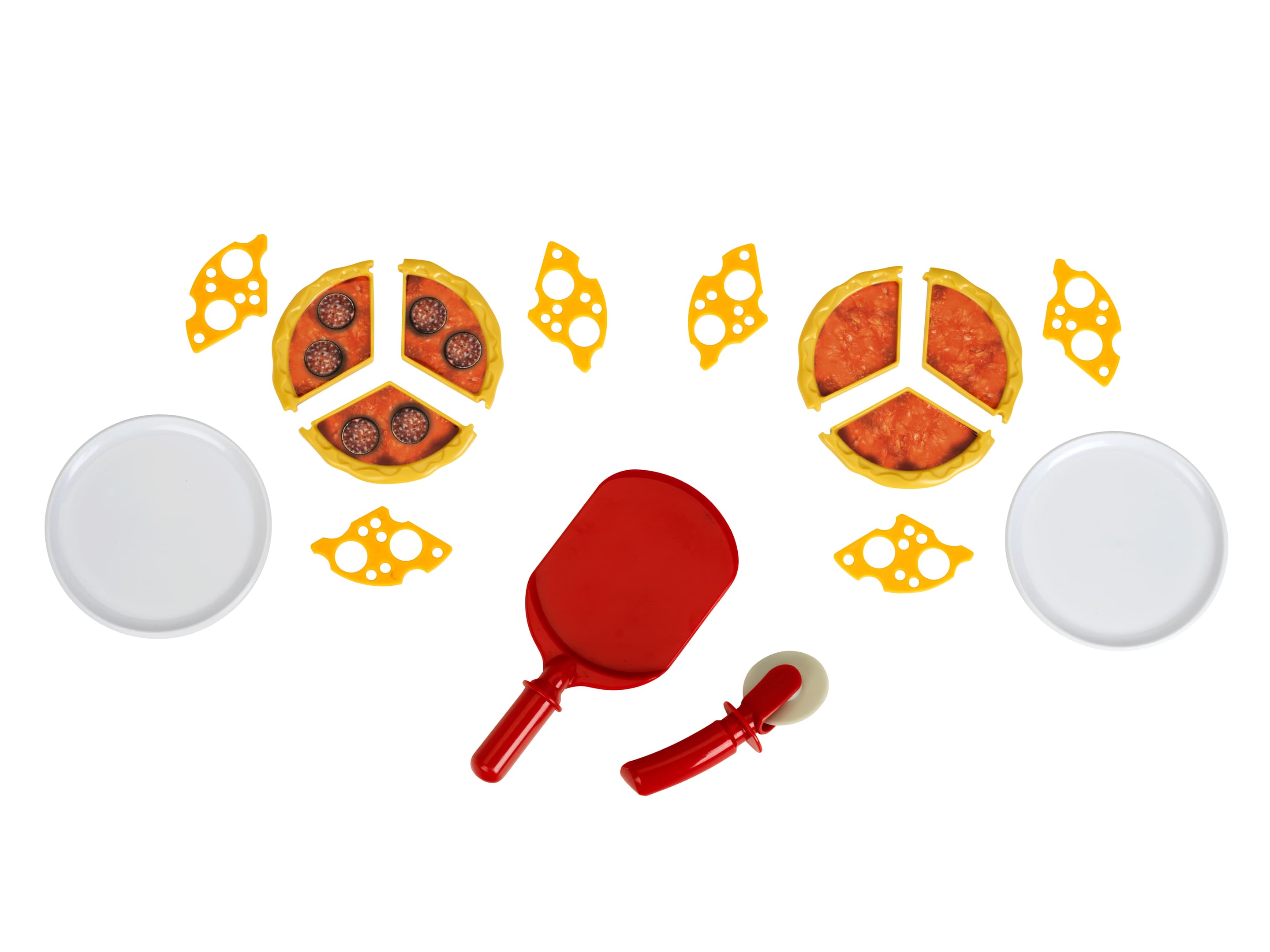 Die Pizza Station enthält umfangreiches Zubehör: Pizzaheber, Pizzarad, zwei Teller, zwei beidseitig bespielbare Pizzen (jeweils 3-teilig) und sechs Käsescheiben - ideal für fantasievolle Rollenspiele.