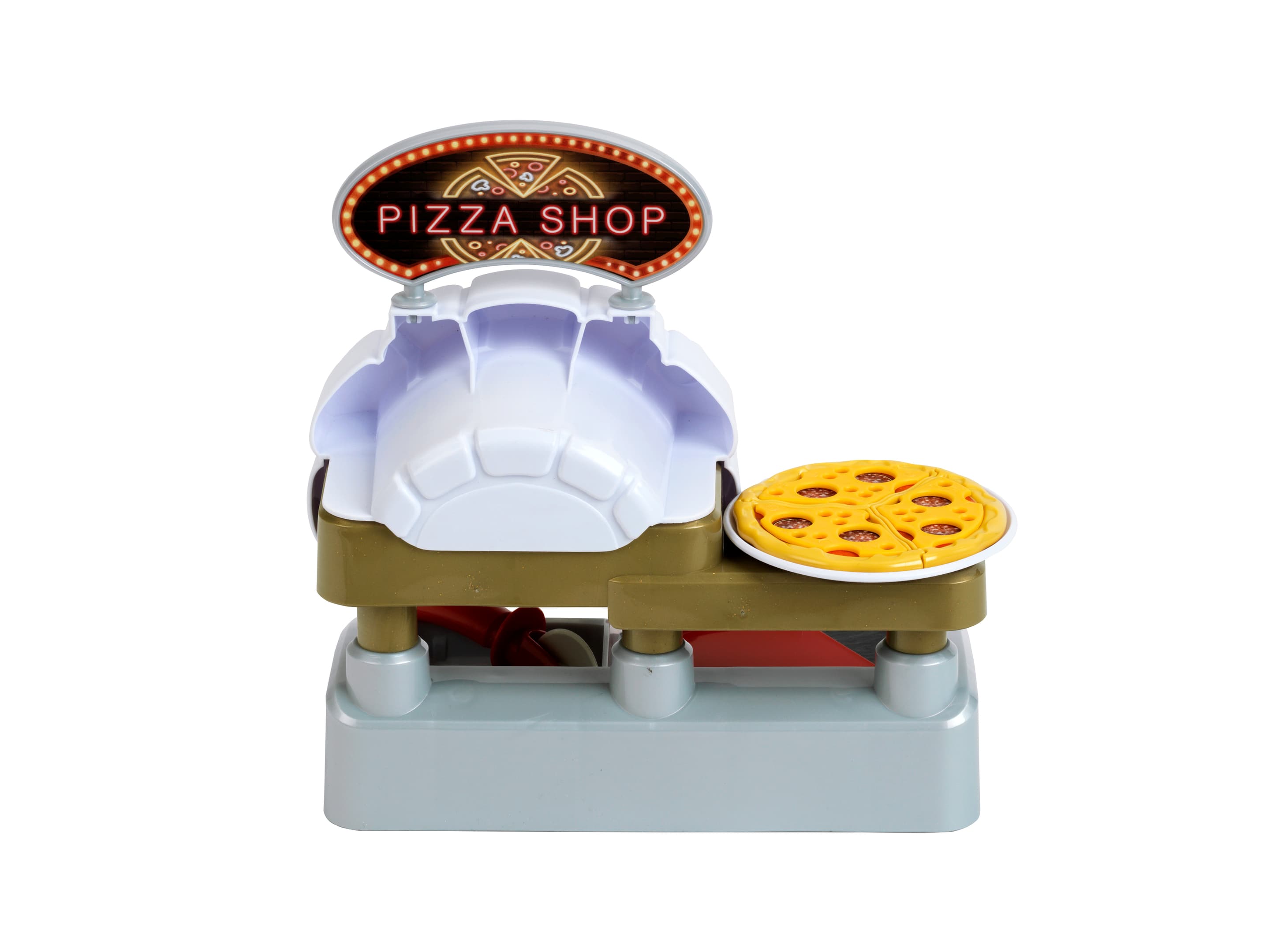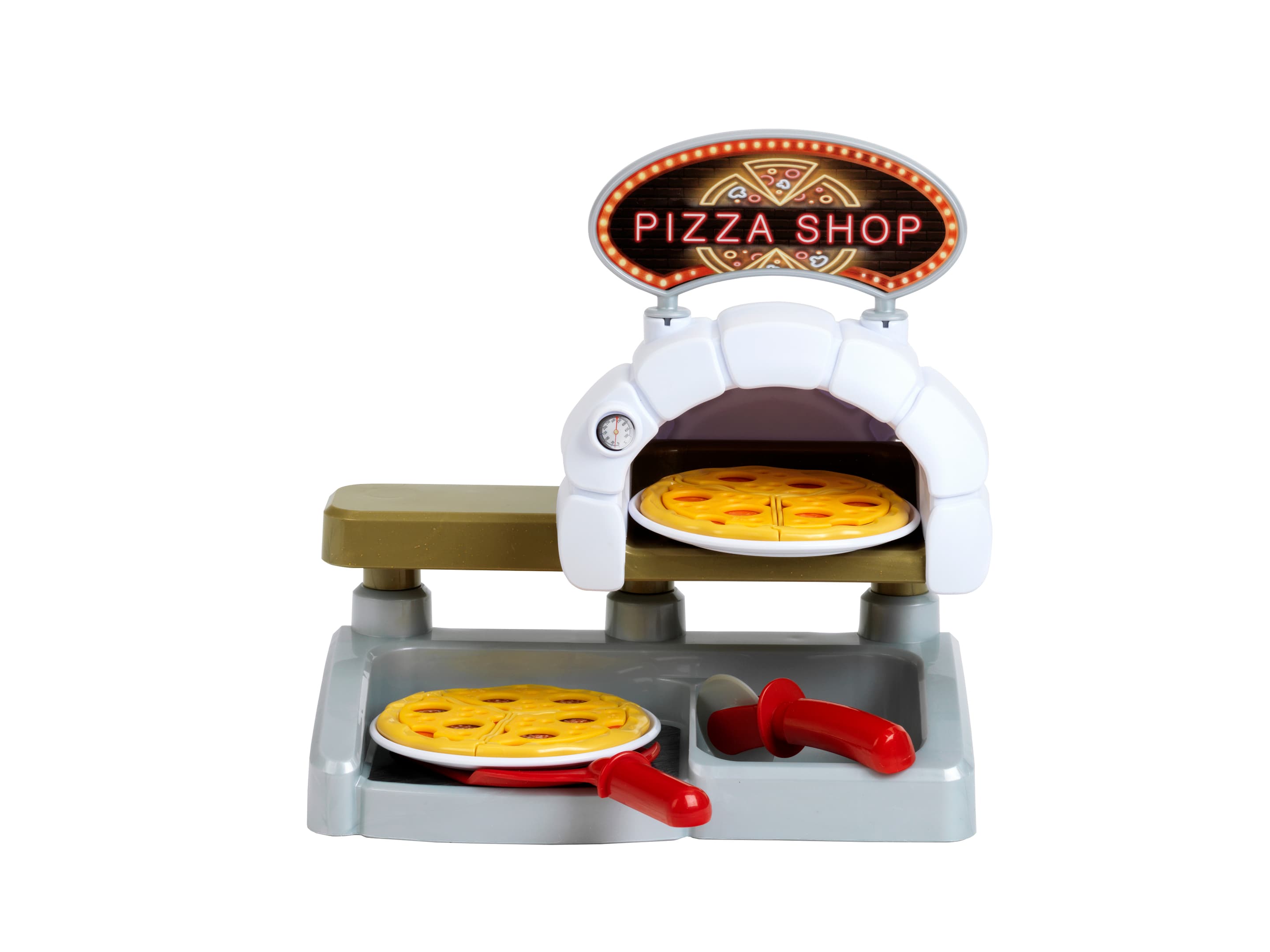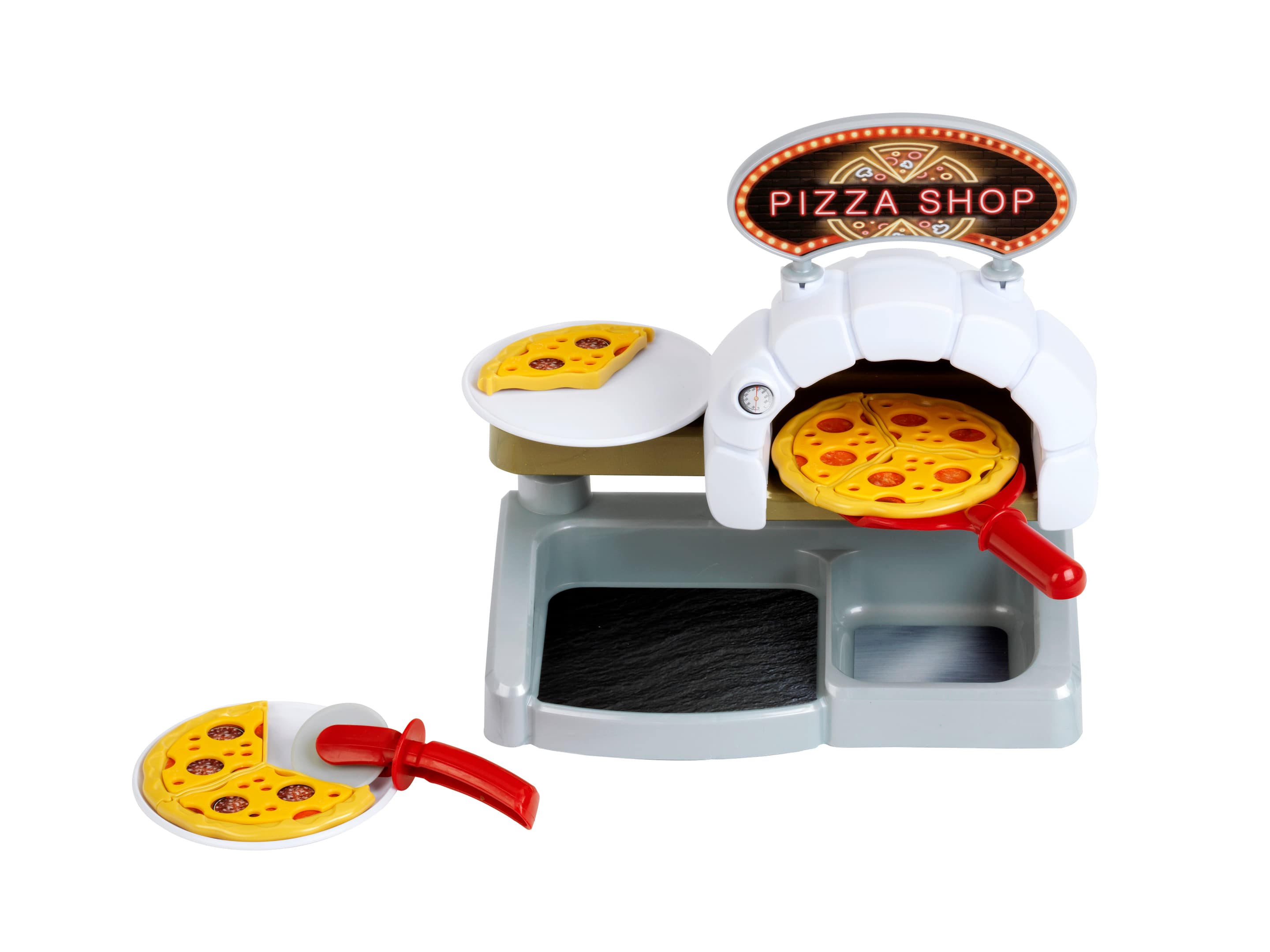 Die Pizza Station enthält umfangreiches Zubehör: Pizzaheber, Pizzarad, zwei Teller, zwei beidseitig bespielbare Pizzen (jeweils 3-teilig) und sechs Käsescheiben - ideal für fantasievolle Rollenspiele.