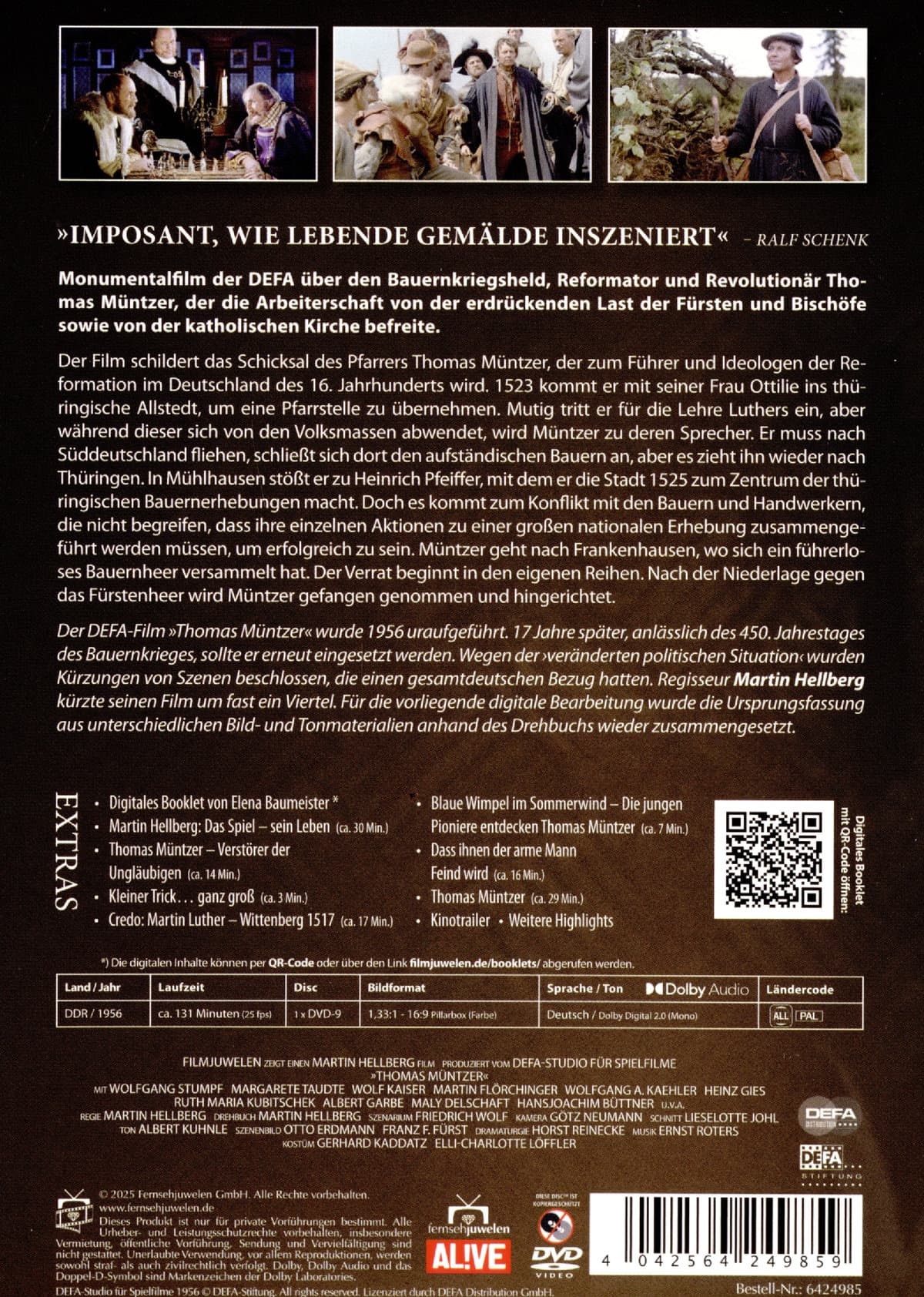 | Zusatzinfos / Bonusmaterial beim Film dabei | Digitales Booklet (online abrufbar) von Elena Baumeister; Martin Hellberg: Das Spiel - sein Leben (ca. 30 Min.); Thomas Müntzer - Verstörerer der Ungläubigen (ca. 14 Min.); Kleiner Trick ... ganz groß (ca. 3 Min.); Credo: Martin Luther - Wittenberg 1517 (ca. 17 Min.); Blaue Wimpel im Sommerwind - Die jungen Pioniere entdecken Thomas Müntzer (ca. 7 Min.); Dass ihnen der arme Mann Feind wird (ca. 16 Min.); Thomas Müntzer (ca. 29 Min,); Kinotrailer; Weitere Hioghlights; Schuber; Wendecover |