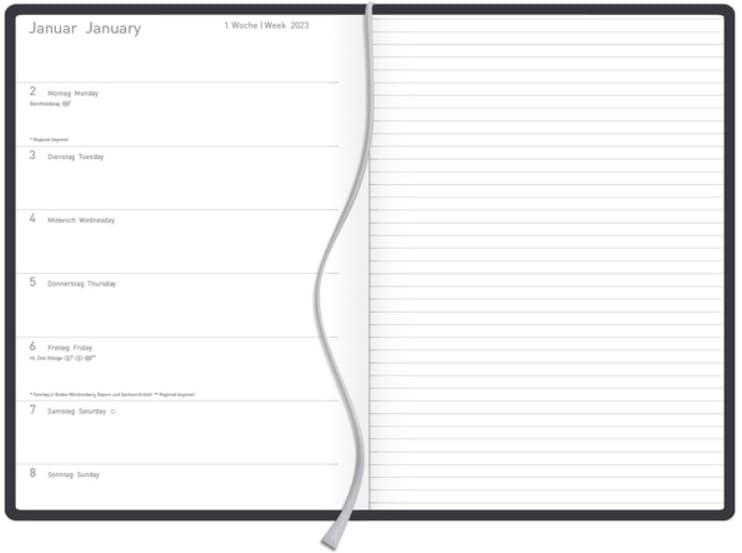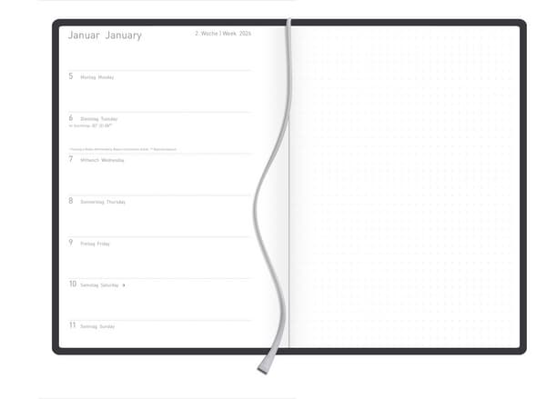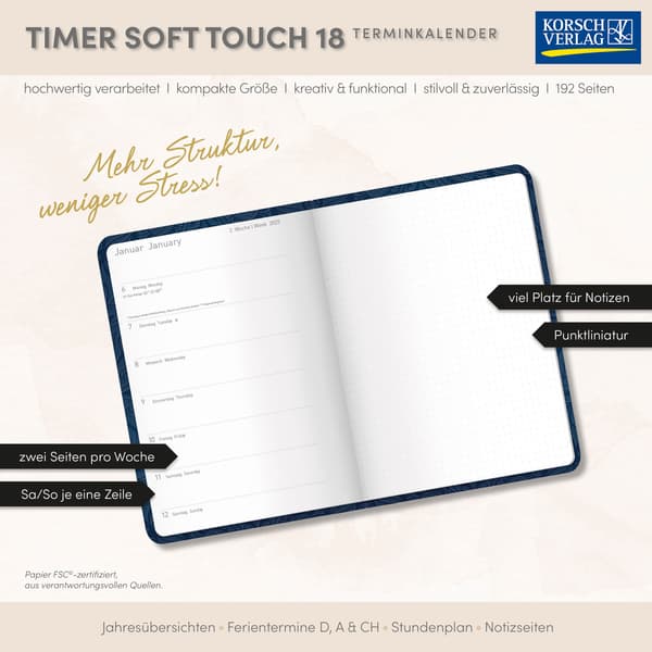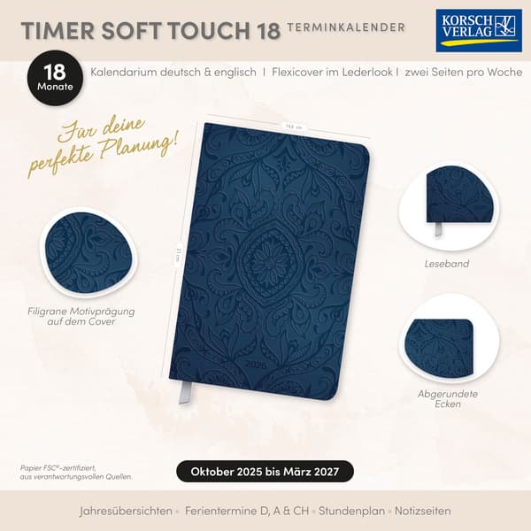 Produktmerkmale Buchkalender im Format: DIN A5, 192 Seiten, umweltfreundliches FSC Papier Kalendarium auf Deutsch und Englisch für 18 Monate (Oktober 2025 - März 2027) Praktische Wochenübersicht; Jede Kalenderwoche übersichtlich auf einer Doppelseite Feiertage und Ferienzeiten für Deutschland, Österreich und Schweiz Viel Platz für Notizen; Stundenplan und Reiseplan Robustes Softcover in Lederoptik Dieser trendige Timer sieht nicht nur gut aus, er fühlt sich auch gut an. Sein weicher Einband im Lederlook mit filigraner Motivprägung verführt dazu, den Kalender nicht mehr aus der Hand legen zu wollen. Ein 18-monatiges, deutschsprachiges Kalendarium, mit pro Woche 2 Seiten mit viel Platz für Notizen und Leseband runden diesen hochwertigen Taschenkalender ab.