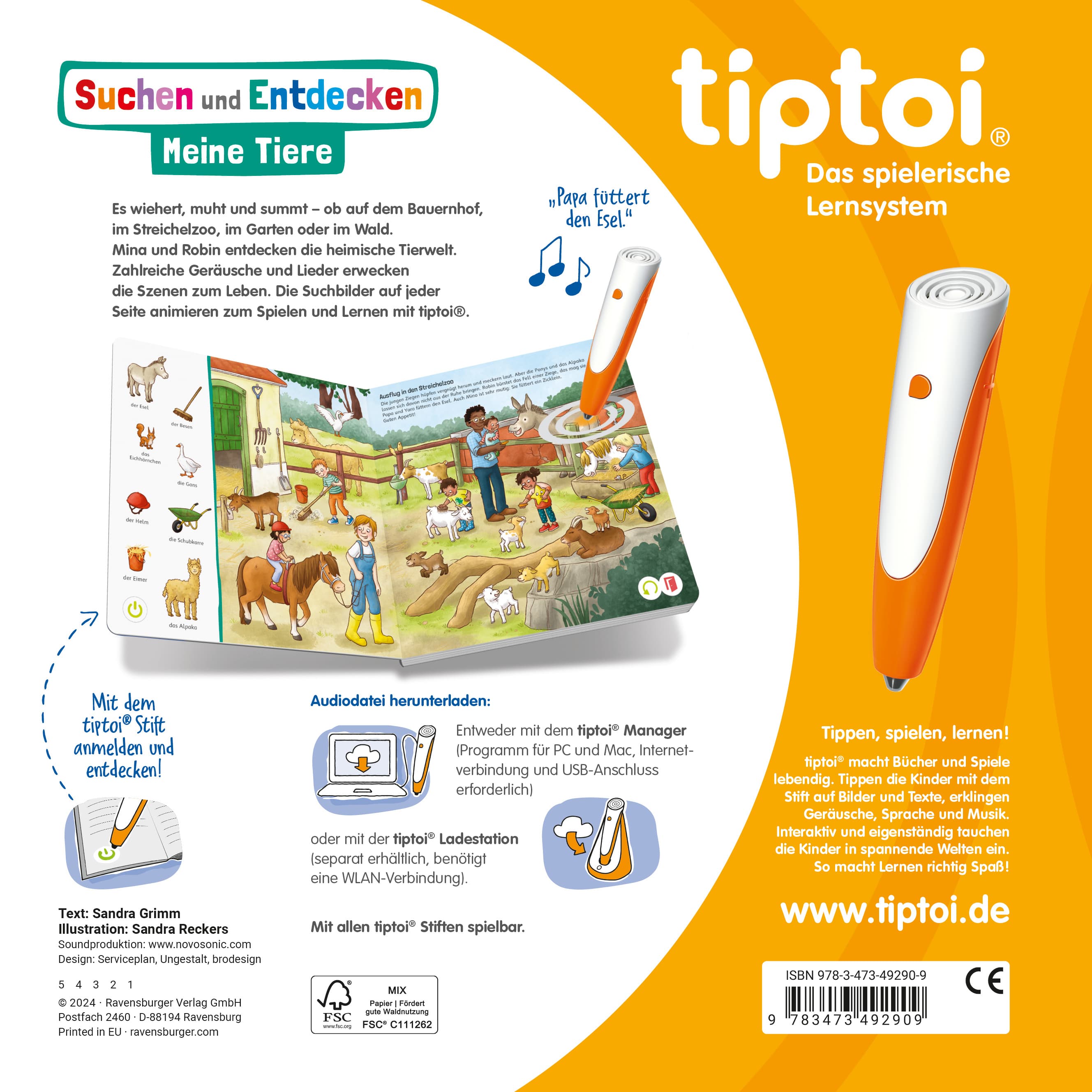 Bei den Tieren ist was los! Auf dem Bauernhof blöken die Schafe, im Garten zwitschern die Vögel und auf der Wiese summt es – in diesem Bilderbuch entdecken die Kleinen die heimische Tierwelt. Sieben liebevoll illustrierte Doppelseiten zeigen Alltagsszenen, in denen Kinder Tieren begegnen: Sie füttern die Ziegen im Streichelzoo, erforschen im Kindergarten Insekten mit der Becherlupe und beobachten die Tiere im Wald. Auf jeder Seite gibt es Suchbilder, die in den Szenen wiedergefunden werden können. Mit der tiptoi-Reihe Suchen und Entdecken erleben kleine Weltentdecker ab 2 Jahren zahlreiche Geschichten, Geräusche und Lieder. In jedem Buch entdecken die Kinder bekannte Szenen aus ihrem Alltag. Die kindgerechten Erzähltexte, Reime und Lieder begegnen den Kindern immer auf Augenhöhe und mit viel Humor. Besonders viel Spaß machen die spannenden Suchbilder auf jeder Seite, die in den großen Szenen wiedergefunden werden können. Das einfache Suchspiel animiert zum genauen Hinsehen, Zuhören und Lernen. Wo liegen die Buntstifte und an welchem Ort hat sich die Katze versteckt? Hier gibt es so viel zu entdecken! tiptoi-Stift nicht enthalten. Muss separat erworben werden.