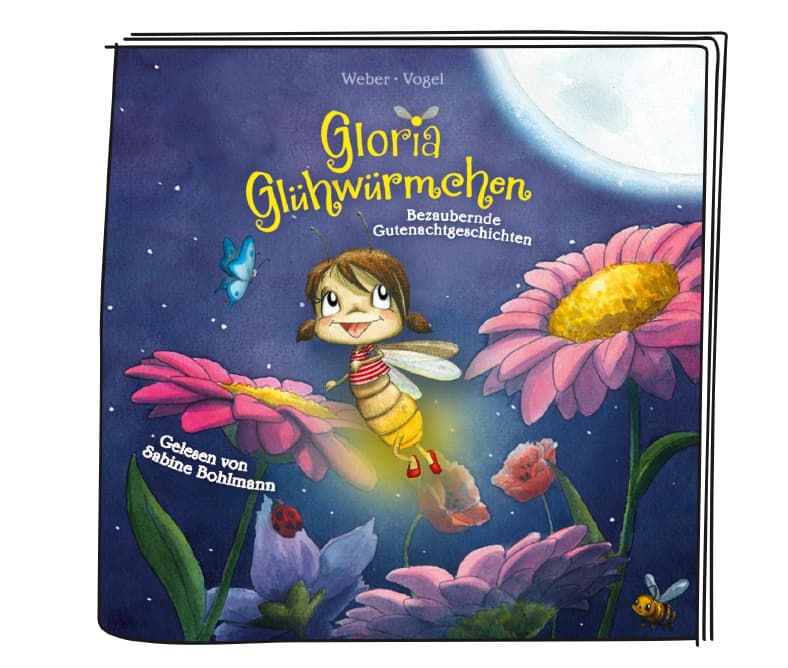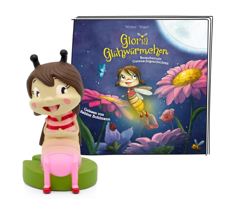 Hörfigur für die Toniebox:Tonies sind Hörfiguren für die Toniebox. Sie machen Hören anfassbar, denn mit ihnen bedient man die Toniebox. Man kann sie aber auch sammeln und mit ihnen spielen. Um der Musik zu lauschen, stellt man die Hörfigur einfach auf die Toniebox.Gloria Glühwürmchen, das liebenswerte und hilfsbereite Glühwurm-Mädchen, wird die Kinderherzen im Handumdrehen erobern! Es gibt so viele aufregende Abenteuer zu erleben im Glitzerwald, und Gloria und ihre Freunde sind bereit, sie zu erkunden. Willkommen im Glitzerwald!Hallo, ich bin Gloria, Gloria Glühwürmchen. Ich bin nicht nur mit Nachnamen ein Glühwürmchen, sondern auch ein richtiges. Tagsüber ruhe ich mich aus, aber wenn es Nacht wird, erwache ich zum Leben. Ich liebe es, in unserem Glitzerwald herumzustreifen und zu sehen, was es zu entdecken gibt.Komm mit und erlebe die Abenteuer von Gloria und ihren Freunden, wie z.B. ihrer Libellenfreundin Lilly Belle, mit. Lass uns gemeinsam durch die Nacht ziehen und die Wunder des Glitzerwaldes entdecken!01. Gloria-Lied Intro02. Gloria Glühwürmchen – das bin ich03. Eine ganz besondere Nacht04. Glühtag05. Glühtag (Teil 2)06. Ein großer Wunsch07. Die Welt von oben08. Die Welt von oben (Teil 2)09. Vom Fliegen und Leuchten10. Vom Fliegen und Leuchten (Teil 2)11. Ausflug in die Menschenwelt12. Ausflug in die Menschenwelt (Teil 2)13. Glühtherapie für Igel Isidor14. Geschichten vom Glühen15. Geschichten vom Glühen (Teil 2)16. Nachtwanderung mit Froschkonzert17. Zauberhafte Freunde18. Zauberhafte Freunde (Teil 2)19. Gloria-Lied