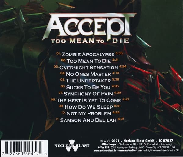 Mit dem Album „Too Mean To Die“ liefert die legendäre Heavy-Metal-Band Accept ein kraftvolles musikalisches Statement. Die CD präsentiert den unverkennbaren Sound der Gruppe in einem modernen Gewand.