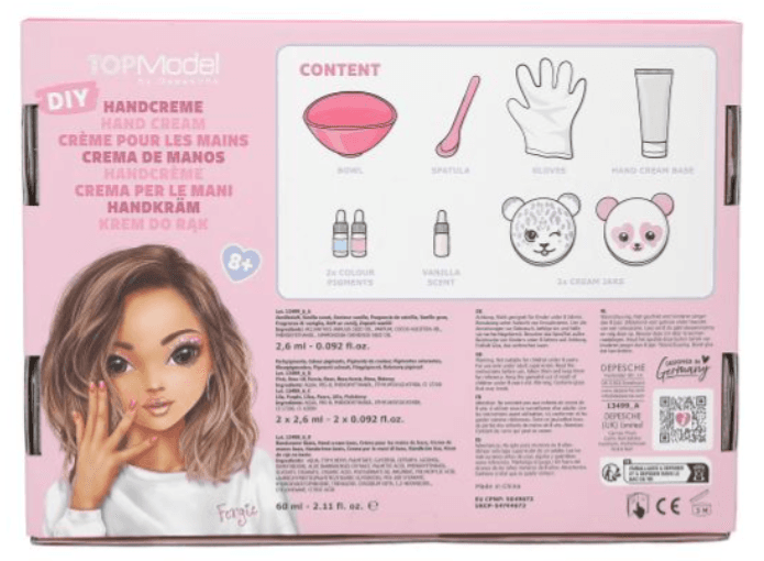 Handcreme zum Selbermachen! Das Set beinhaltet Schüssel, Spatel, Handschuhe, eine Tube Basis-Handcreme, zwei Fläschchen Farbpigmente, ein Fläschchen Vanille-Duft sowie zwei Behälter in Tierform für die fertige Handcreme.