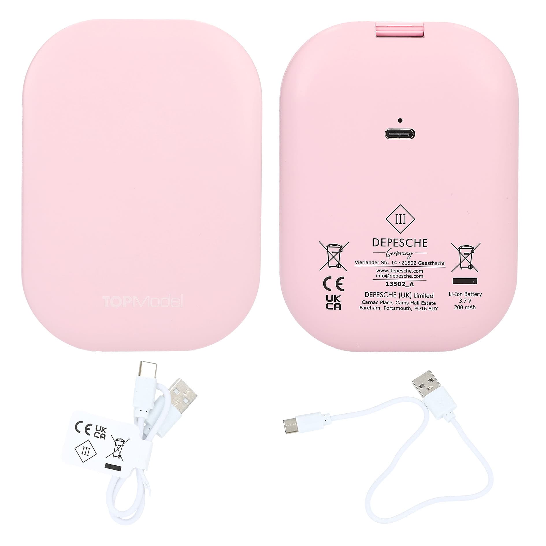 Der ultimative Beauty-Spiegel für unterwegs: Der handliche rosafarbene Taschenspiegel hat innen einen normalen Spiegel und einen Spiegel mit zweifacher Vergrößerung. Praktisch: mit LED-Lichtkranz im unteren Spiegelelement, der über einen Touch-Sensor gesteuer wird: An/Aus/Lichtwechsel (3 Lichtstufen). Wiederaufladbar, inkl. USB-C-Ladekabel. Von TOPModel.