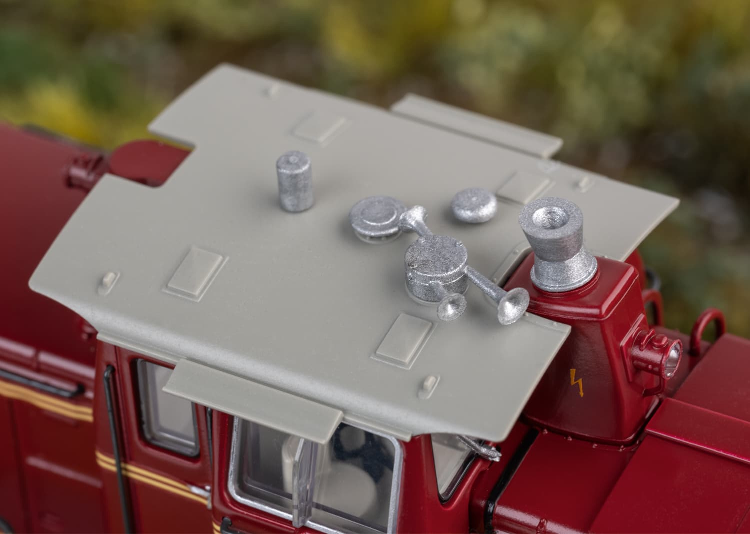 Modell: Mit Digital-Decoder und umfangreichen Geräuschfunktionen. Geregelter Hochleistungsantrieb. Eine Achse angetrieben, zwei Achsen und Blindwelle über Kuppelstangen angetrieben. Haftreifen. Fahrtrichtungsabhängig wechselndes Dreilicht-Spitzensignal und zwei rote Schlusslichter konventionell in Betrieb, digital schaltbar. Führerstandbeleuchtung digital schaltbar. Triebwerkbeleuchtung digital schaltbar. Doppel-A-Licht schaltbar. Beleuchtung mit wartungsfreien warmweißen und roten Leuchtdioden (LED). Mit Pufferspeicher. Telex-Kupplungen vorne und hinten jeweils separat digital schaltbar. Angesetzte Griffstangen und Geländer aus Metall. Länge über Puffer ca. 12 cm.