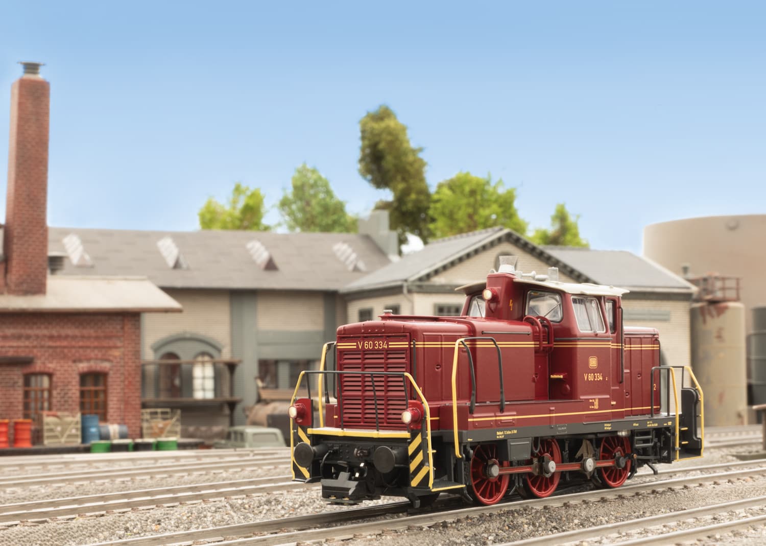 Vorbild: Diesel-Rangierlokomotive Baureihe V 60 der Deutschen Bundesbahn (DB). Purpurrote Grundfarbgebung. Dieselhydraulischer Antrieb mit Blindwelle. Vorbauten und Führerhaus der Serienausführung. Führerhausdach in der Bauform der Loks bis ca. V 60 390. Führerhausdach mit Lüftungsklappen. Erste Form des Schalldämpfers. Dofa-Ofen mit Kohlefeuerung, Kohlebehälter am rechten Umlauf hinter dem Dofa-Ofen. Betriebsnummer V 60 334. Betriebszustand um 1960.