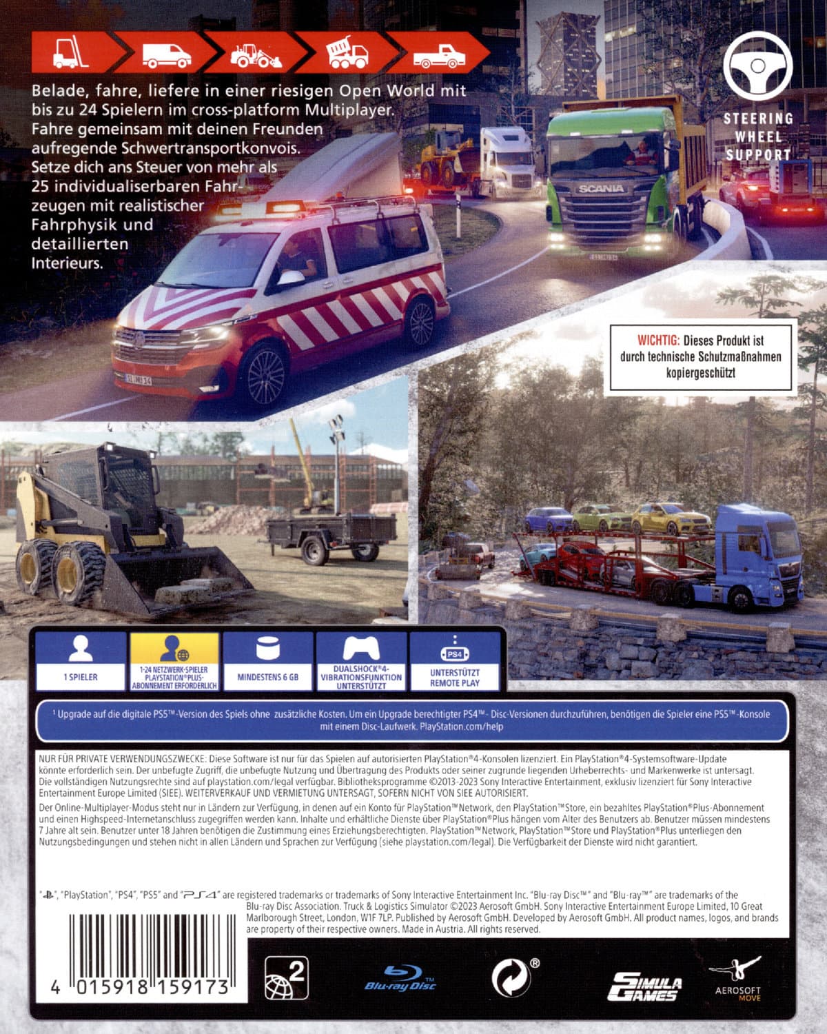 • Realistische Fahrzeugtransporte (Autos, Gabelstapler, Radlader, Geländefahrzeuge)