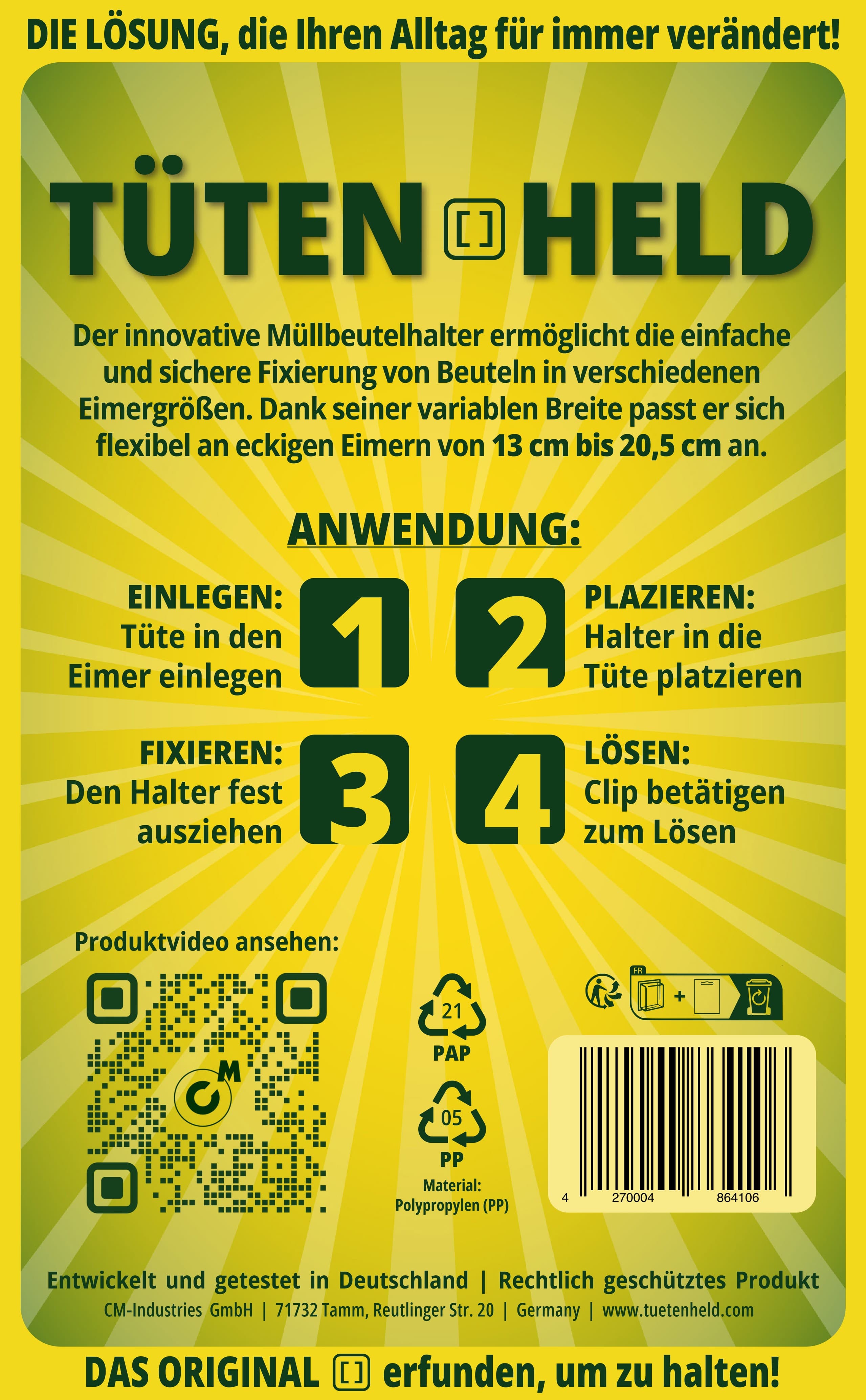 Der innovative Müllbeutelhalter ermöglicht die einfache und sichere Fixierung von Beuteln in verschiedenen Eimergrößen. Dank seiner variablen Breite passt er sich flexibel an eckigen Eimern von 13 - 20,5cm an.