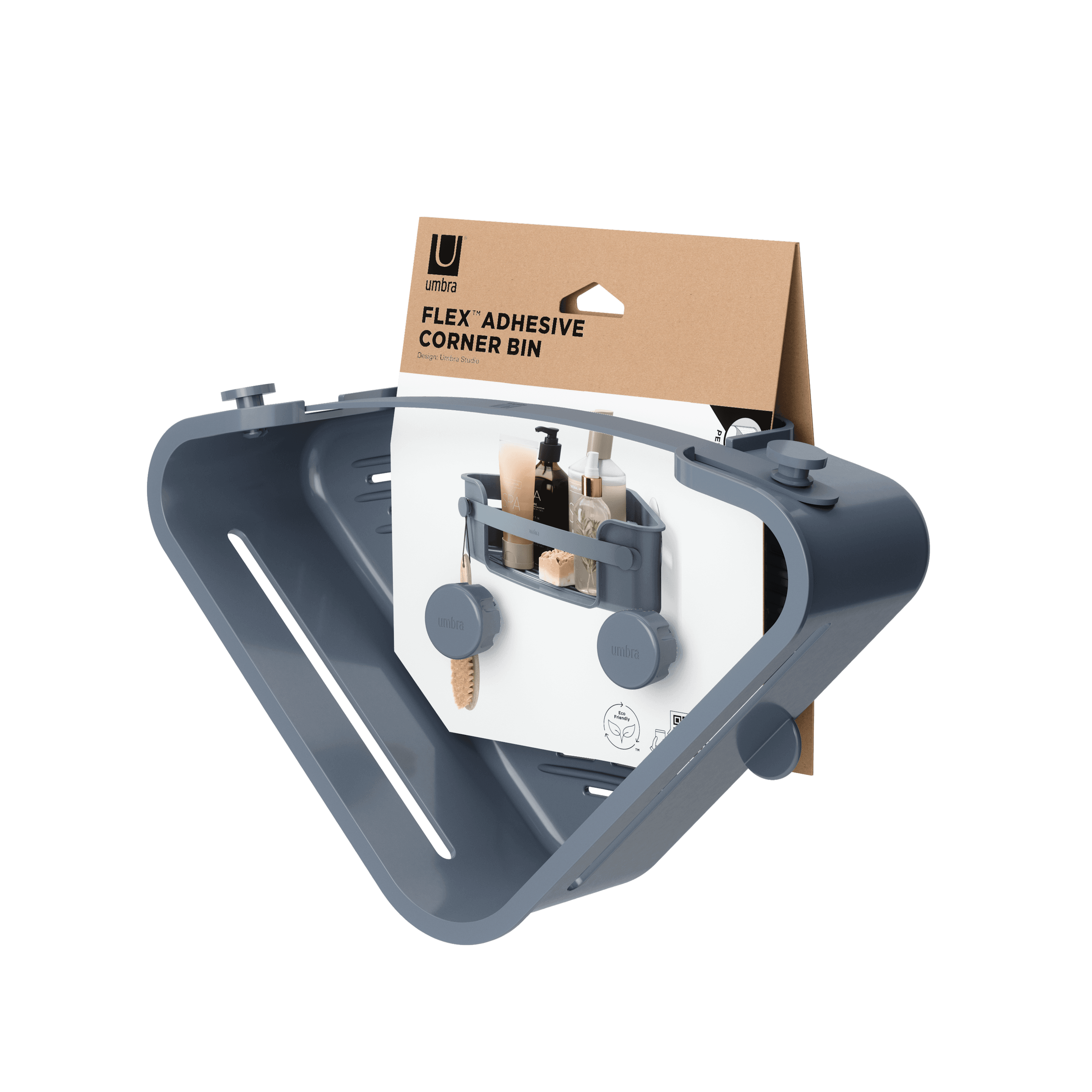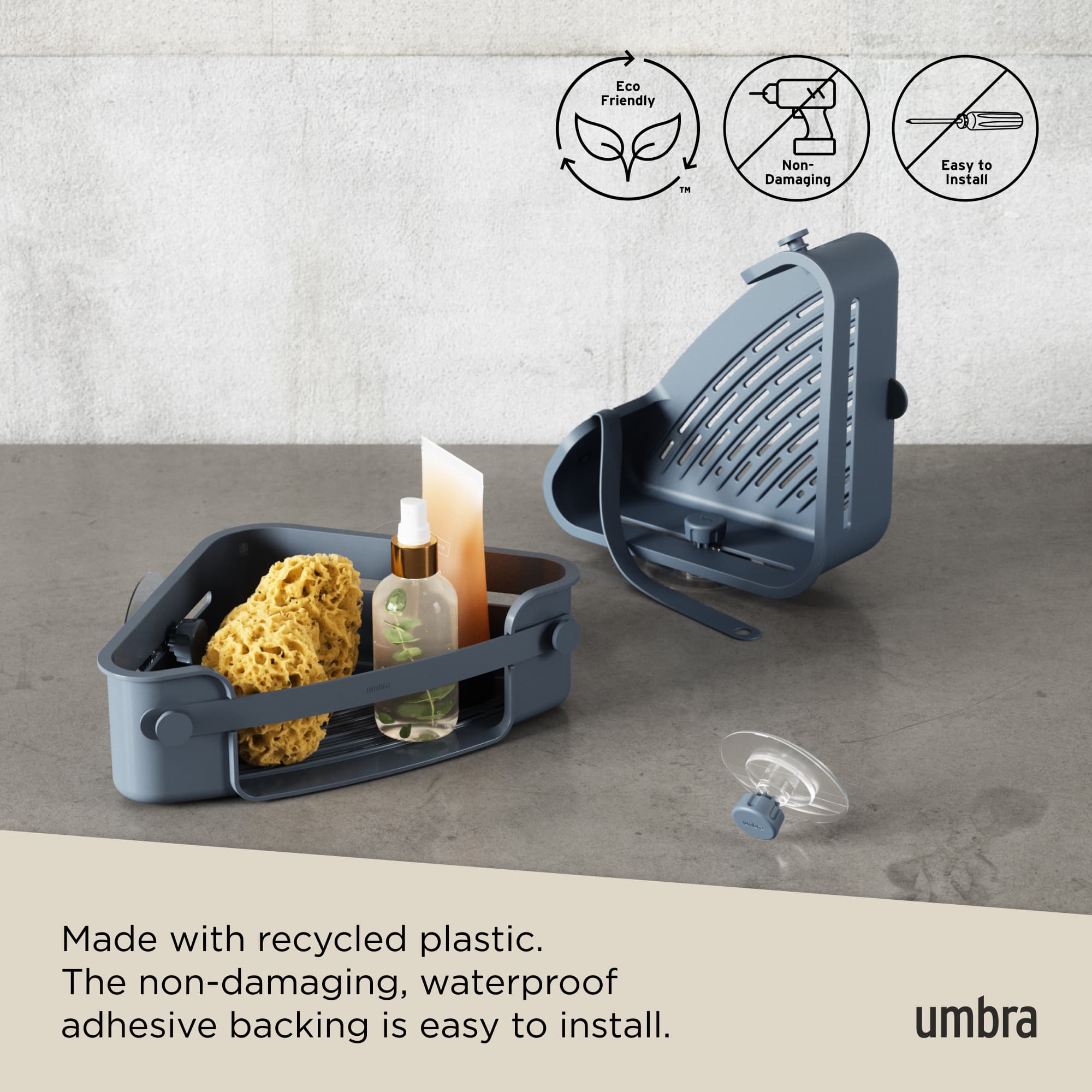 Das Flex Eckregal macht Gebrauch von ungenutztem Platz in Ihrer Dusche und hält all Ihre wichtigen Duschutensilien griffbereit. Die einfach zu installierende Flex Eckduschablage zum Kleben enthält abziehbare, wasserfeste Klebestreifen, die auf verschiedenen Oberflächen wie Fliesen, Rigipswänden, Beton usw. angebracht werden können (funktioniert nicht auf porösen Oberflächen). Das Eckregal verfügtüber eine integrierte Seifenschale, Platz für Shampoo, Spülung, Duschmittel, Rasierer und zwei Haken für Duschschwamm und Waschlappen. Bei Bedarf lässt sich das Eckregal leicht entfernen und an einen anderen Ort bringen. Größe: 32,5x19x9 cm. Teil der Umbra Flex Bad Kollektion zum Kleben. Zu 85% aus recyceltem Kunststoff hergestellt.