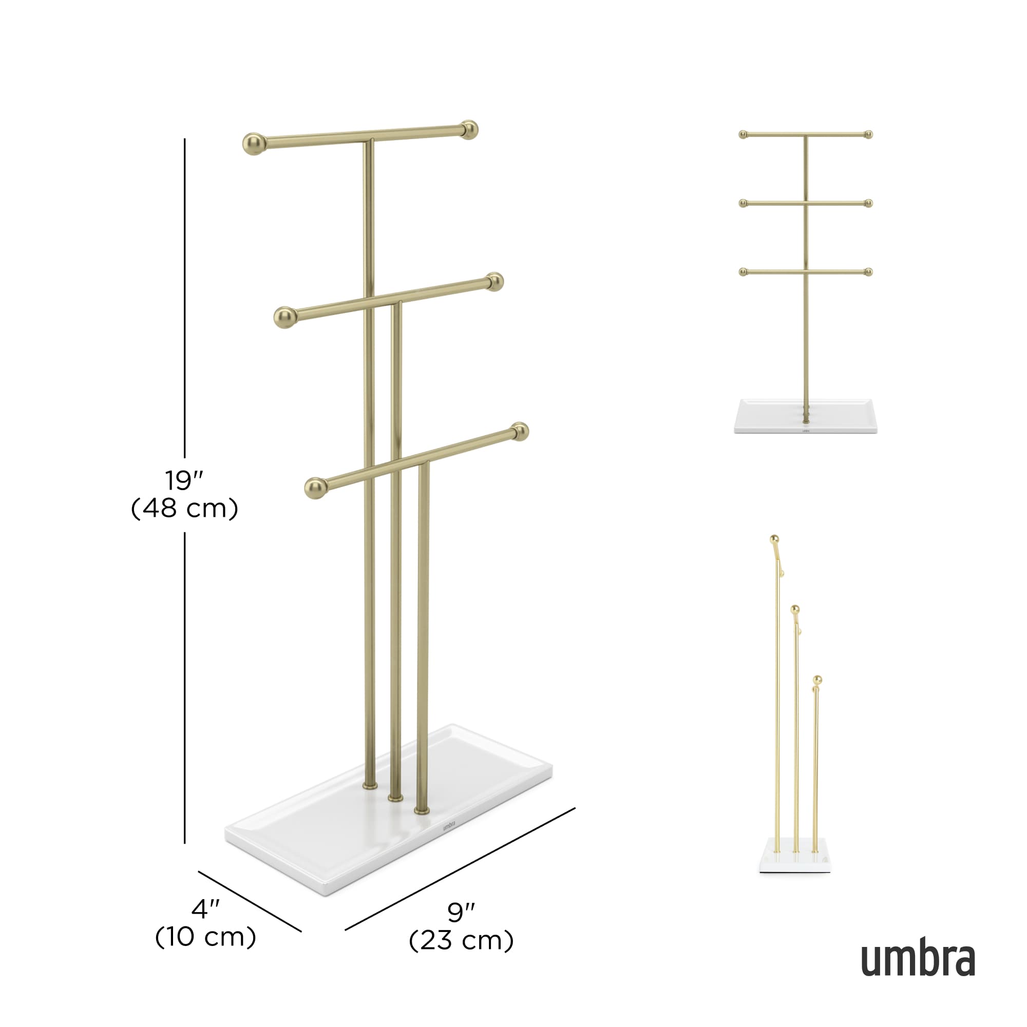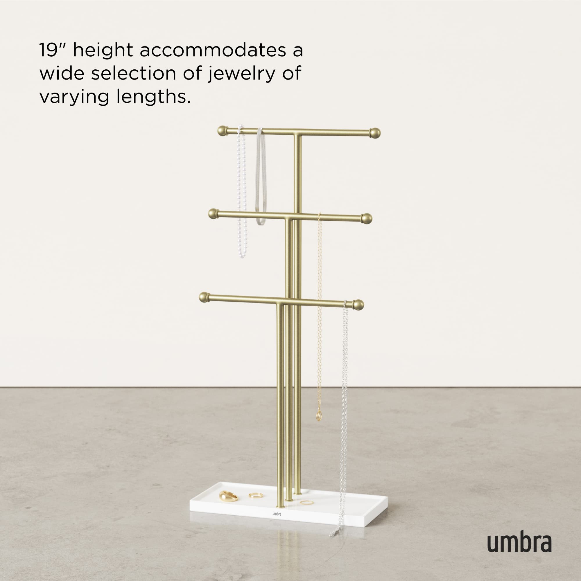 Trigem Schmuckbaum bietet über 3 unterschiedlich hohe Stangen Aufbewahrung für Ihre Lieblingsketten. Sein Fuß kann als Schmuckablage für Ringe, Uhren, Ohrringe und andere kleinteilige Accessoires genutzt werden. Trigem's schlichtes und modernes Design ziert garantiert jede Kommode, jeden Nachttisch, Schminktisch und Schreibtisch. Die Gumminoppen an der Unterseite verhindern das Verkratzen von Oberflächen.